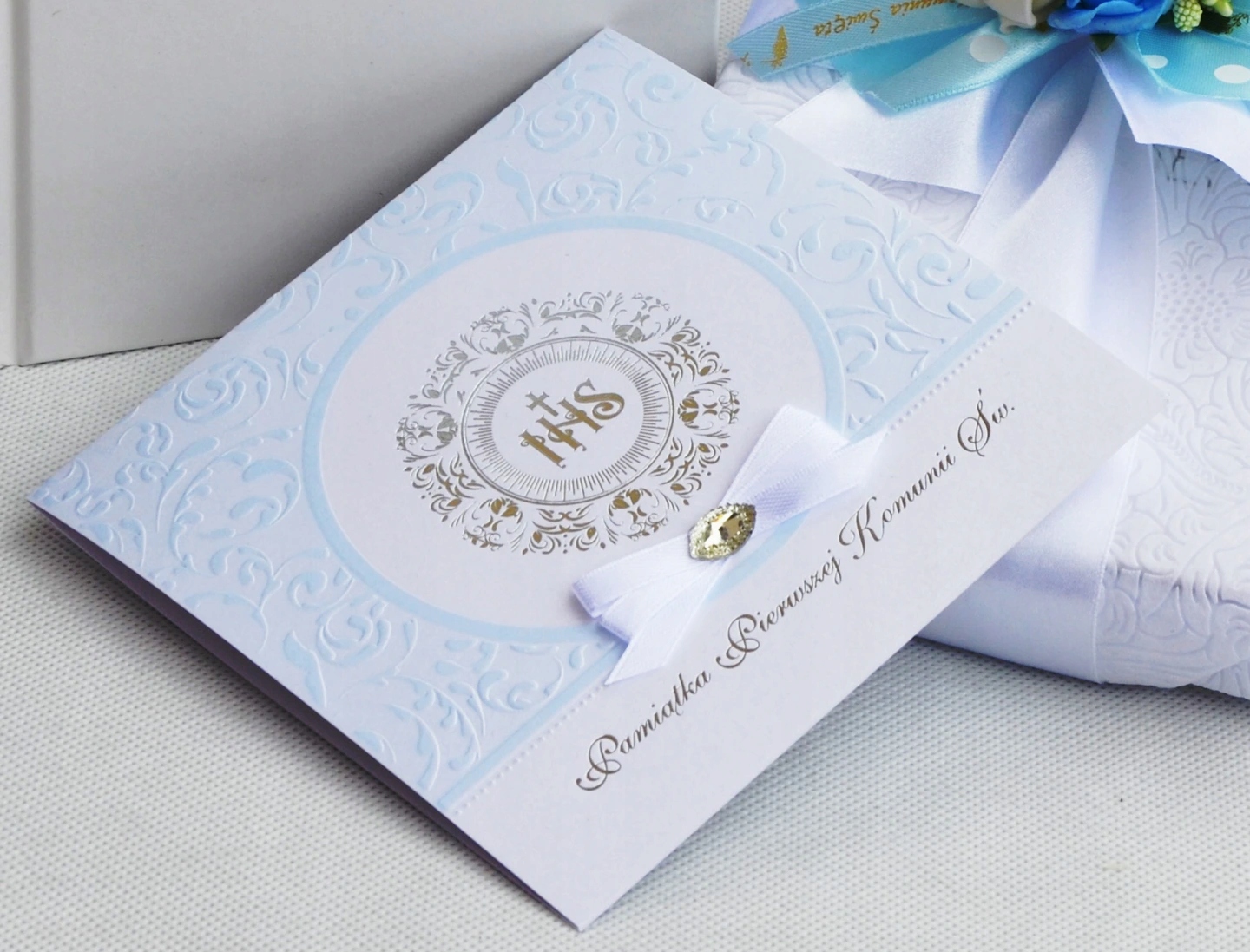 Эксклюзивный сувенир на Первое Святое Причастие имеет цвет, соответствующий каждому набору (светло-розовый, синий, белый). Центр открытки состоит из красивых позолоченных пожеланий.
