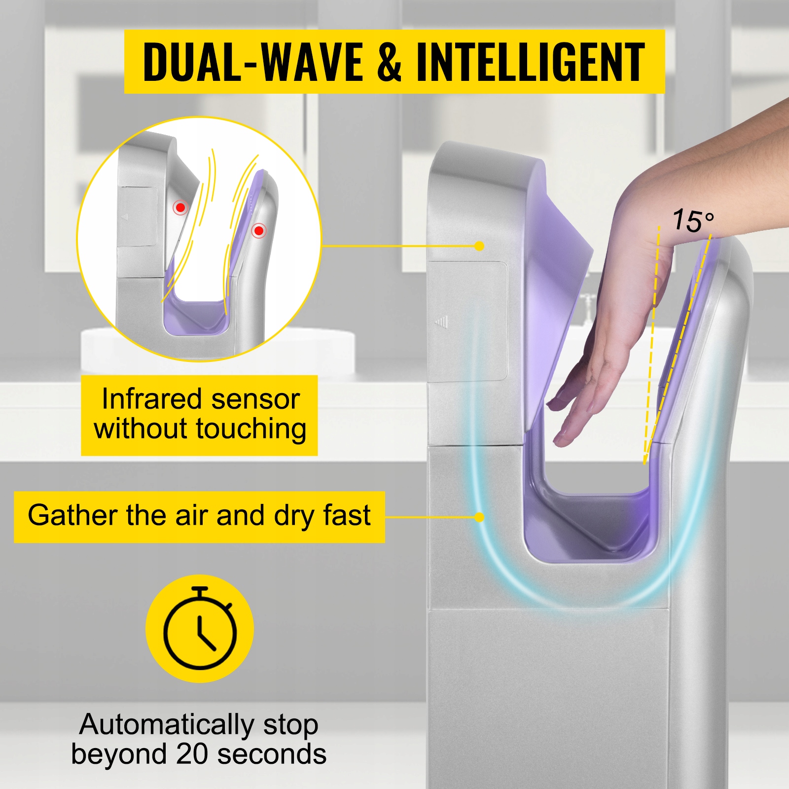 Наша струйная сушилка для рук обеспечивает время сушки всего 8–10 секунд и сочетает в себе производительность и низкий уровень шума благодаря использованию мощного двигателя.