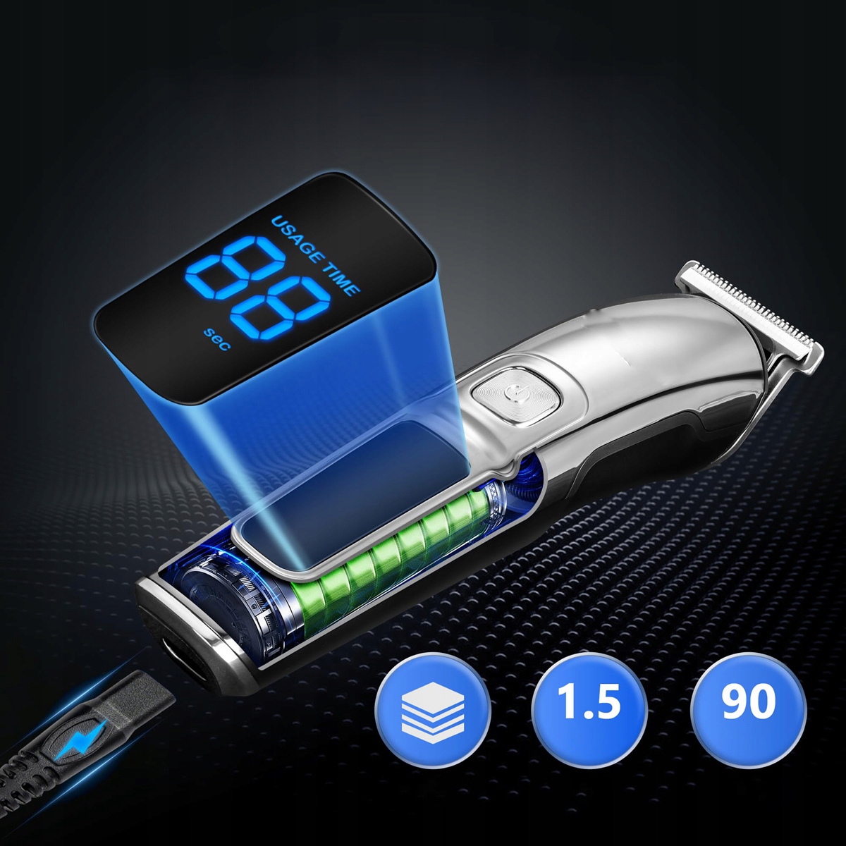 В этом наборе резки используется структура зарядки USB, так что вы можете найти источник зарядки в любое время. Встроенная литий-ионная батарея долговечна и идеально подходит для путешествий. Гуманизированный светодиодный дисплей позволяет вам в любое время проверять оставшуюся мощность триммера и напоминает вам о необходимости пополниться вовремя. Этот набор обрезки заряжен в течение 1,5 часов и работает в течение 90 минут.