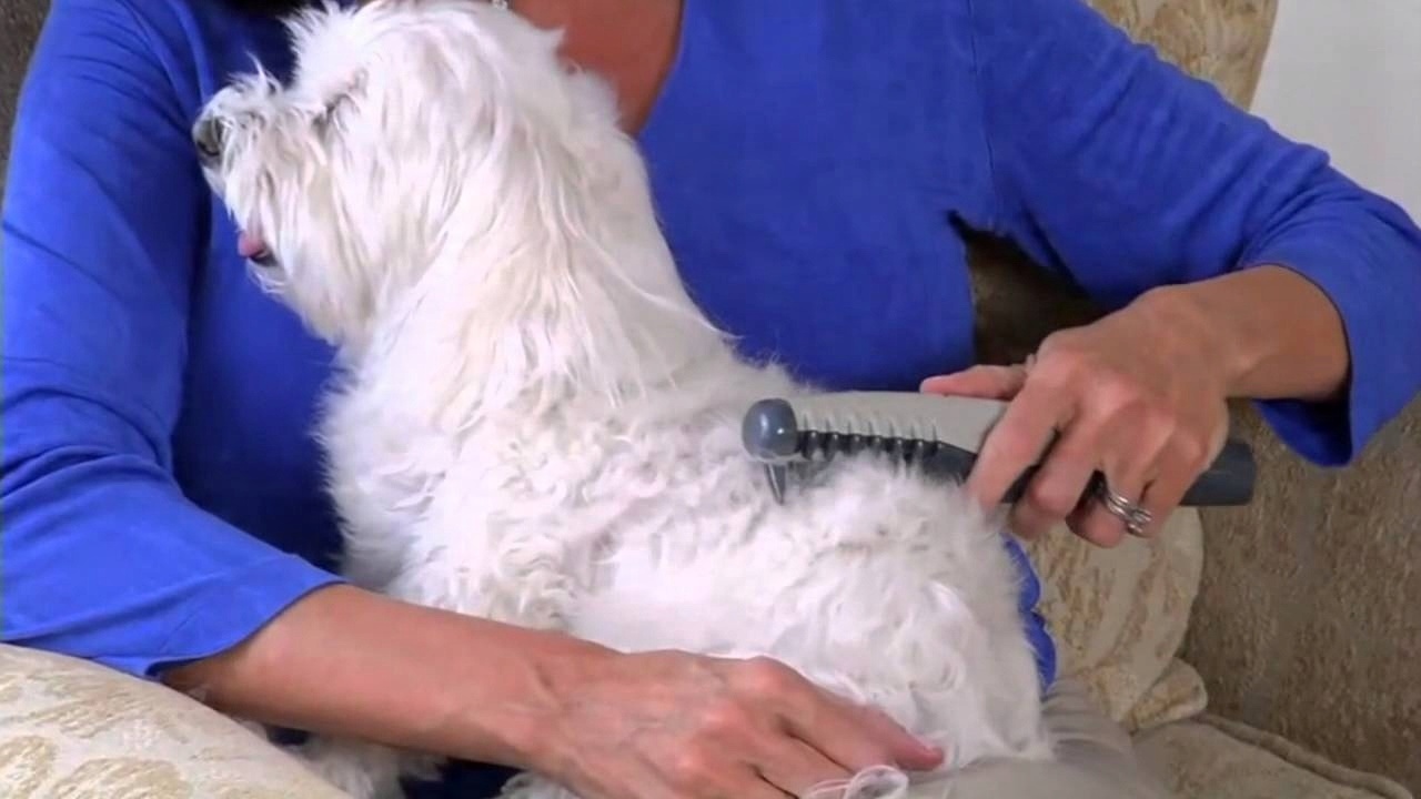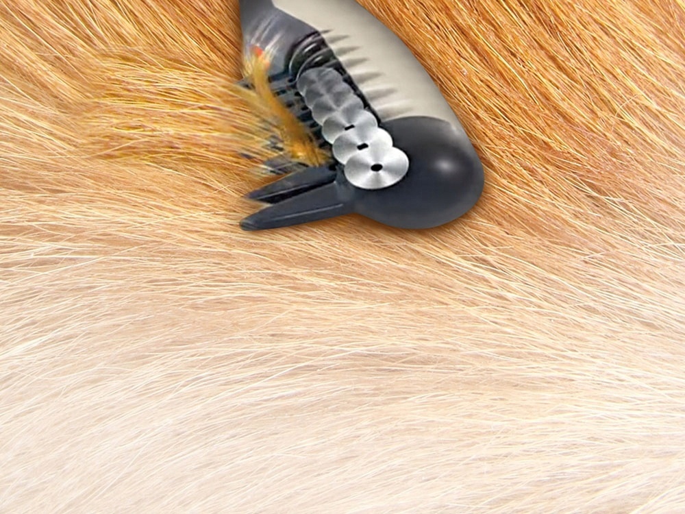 Включаем прибор нажатием кнопки и расчесываем животное как традиционной расческой. За это время вращающиеся на высокой скорости лезвия рассекают колтуны и спутанные волосы. Лезвия закреплены таким образом, что не могут поранить нашего питомца.