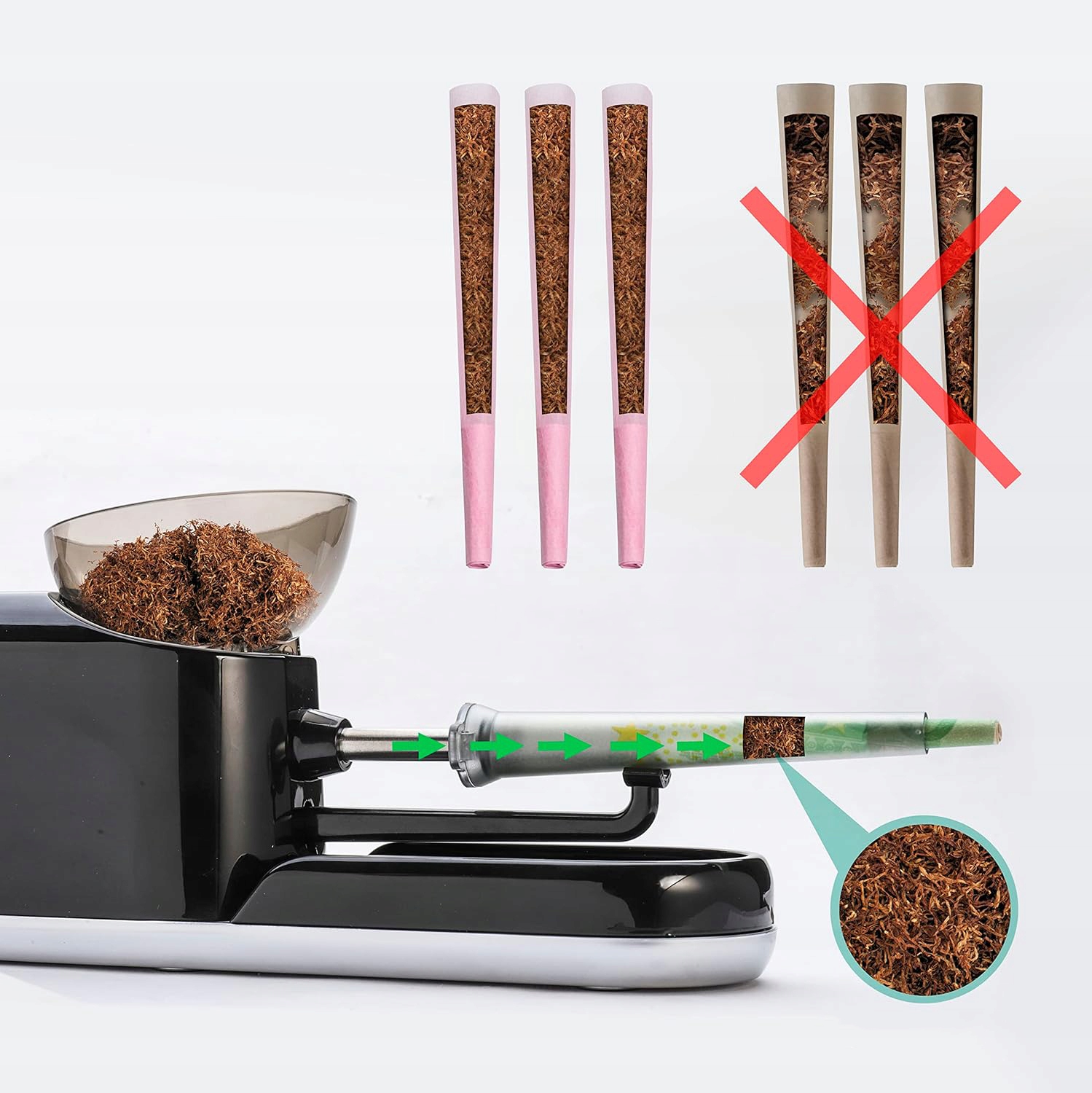 🚬 Удобное использование: Заполните свои предварительно связанные шишки без беспорядка. Чтобы получить отличные результаты, перед заполнением табака Grind, чтобы предотвратить предотвращение устройства. Если оно заблокировано, немедленно остановите устройство, удалите блокировку, а затем перезапустите его.