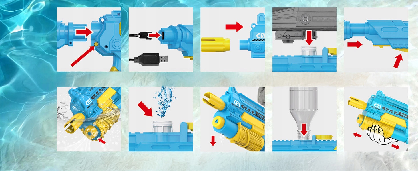Водяной пистолет имеет встроенный батарею 7,4 В, при зарядке просто удалите колбу с пистолетом и подключите специальный USB -кабель для быстрой зарядки. Примечание: 1. Перед использованием полностью заряжайте батарею. 2. Аккумулятор должна быть заряжена в течение времени, когда питание аккумулятора недостаточно, чтобы избежать чрезмерного разряда батареи и повреждения батареи. 3. Не погружайте водный пистолет в воду, в противном случае он может повредить внутреннюю цепь.