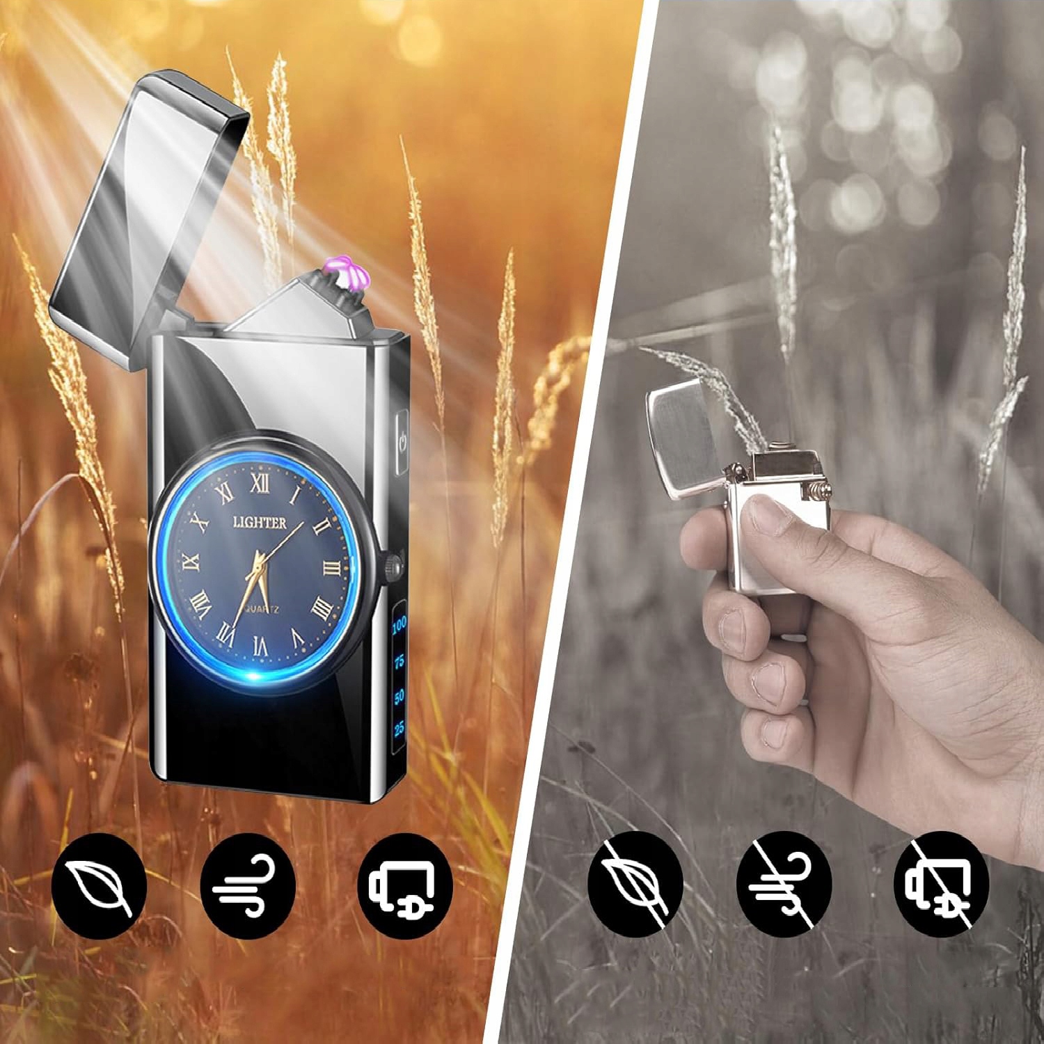 💖💖💖 Улучшенный дизайн ▶ Угол зажигания 75° обеспечивает более быстрое и равномерное зажигание. Традиционные зажигалки ограничены узкой горловиной, что препятствует лучшему зажиганию. Многофункциональный дизайн 3-в-1, сочетающий в себе функции зажигалок, часов и фонарей, делает зажигалки более широко используемыми. Подходит для использования в помещении и на открытом воздухе.