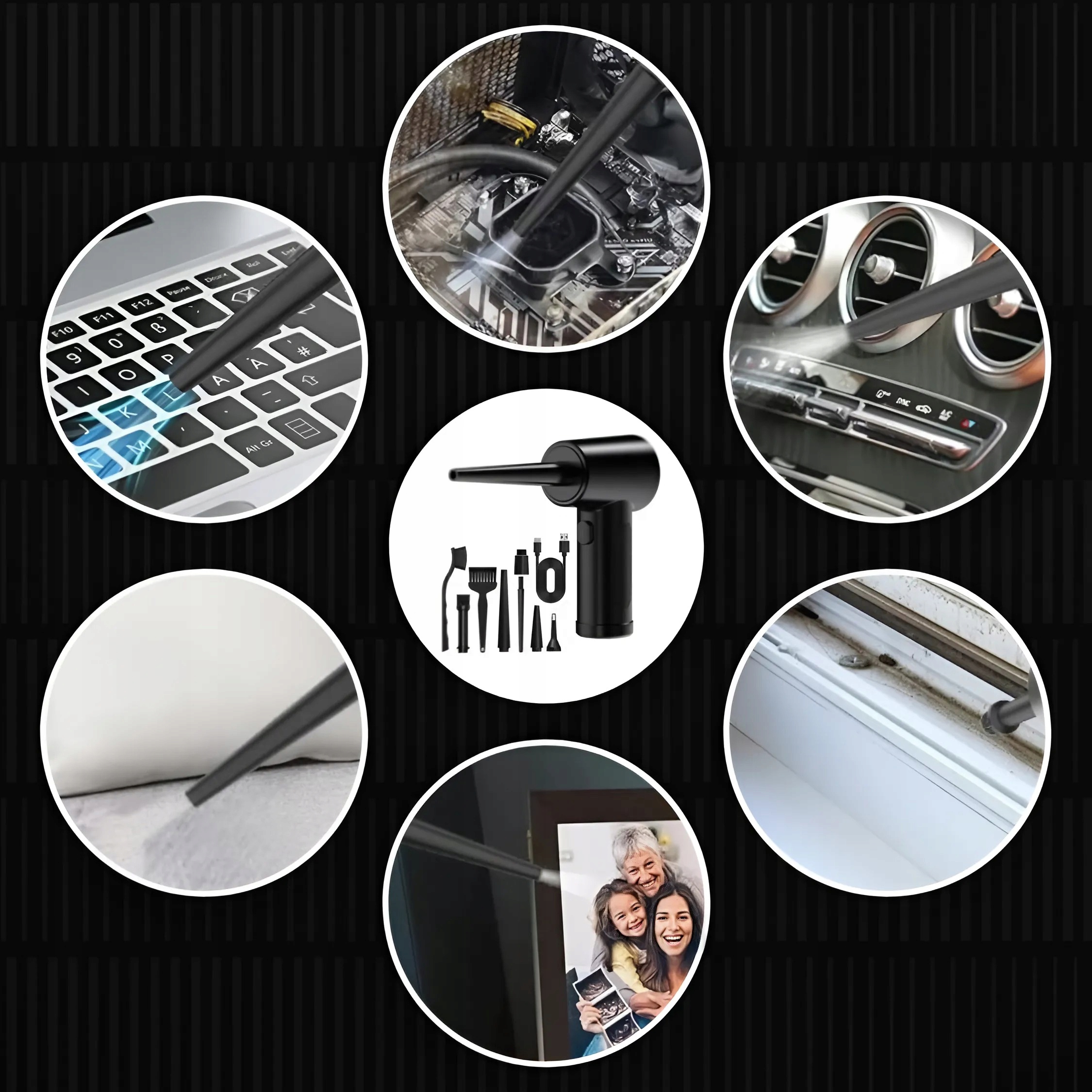 ✅ Широкий набор аксессуаров: В комплект входят 5 воздушных насадок и 3 щетки. которые позволяют тщательно очищать электронное оборудование, клавиатуры, мебель и другие поверхности.