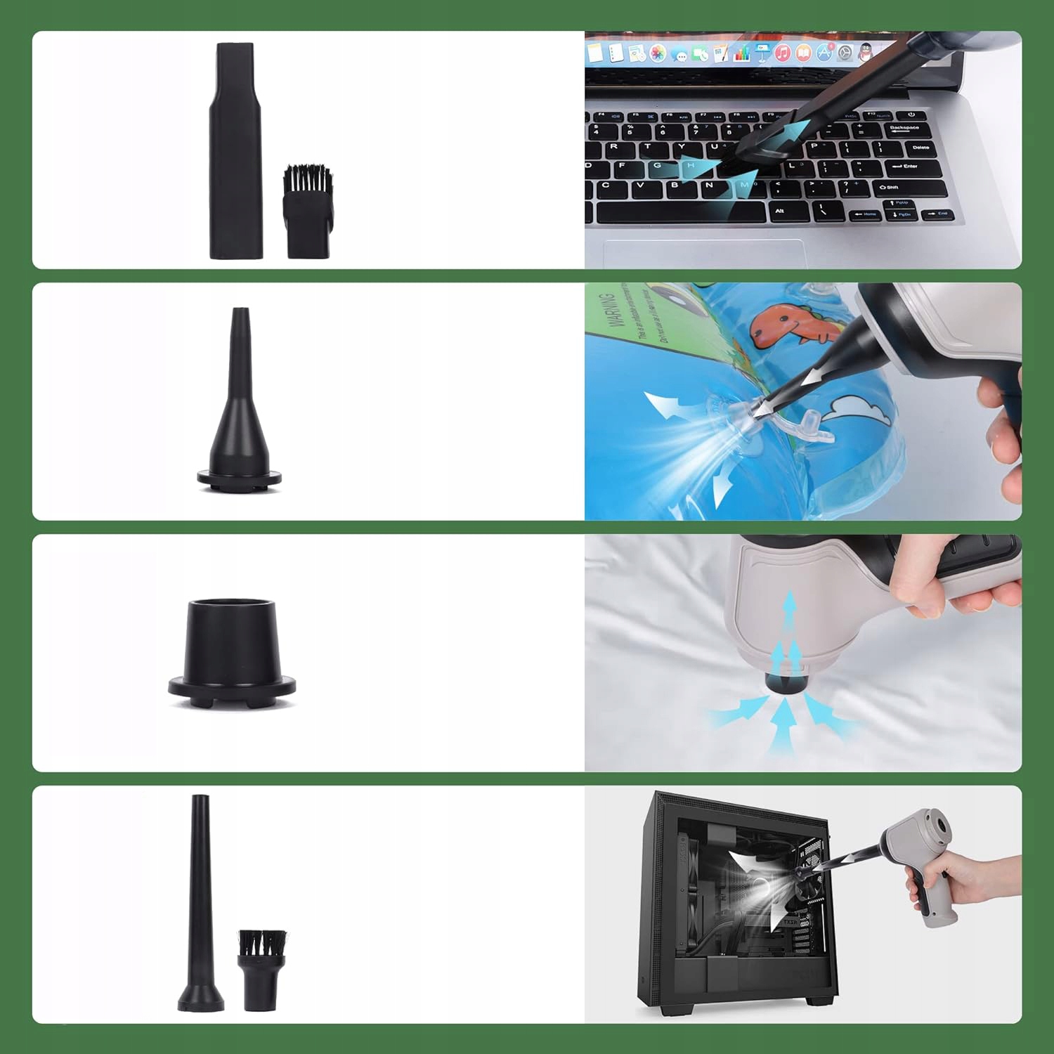 Плоская насадка: подходит для выдувания пыли в углах и щелях, например: ящиках, столешницах, углах шкафов, автомобильных дверях или окнах и т. д. прорези для чистки.