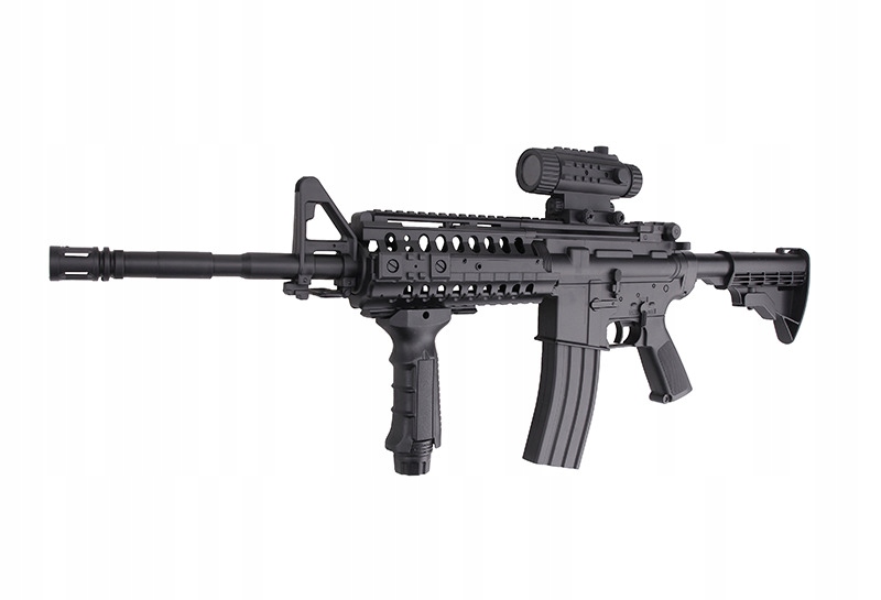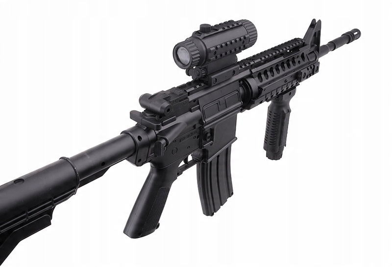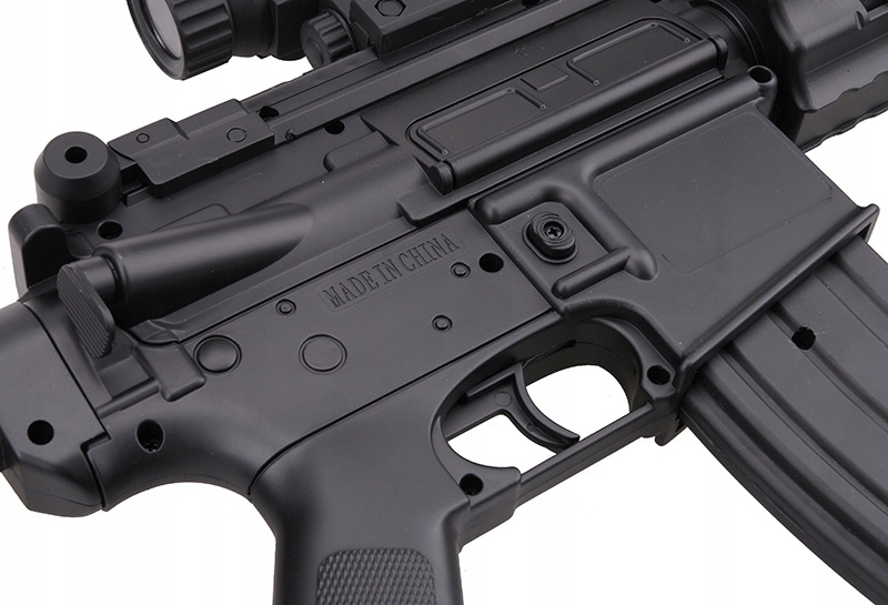 Точная копия штурмовой винтовки M4 A1 изготовлена из очень прочного АБС-пластика и металлических элементов, размещенных в критических местах. Он отличается хорошим качеством изготовления и вниманием к деталям, таким как регулируемый прицел в ручке для транспортировки. Ручка для транспортировки съемная и позволяет устанавливать дополнительные аксессуары