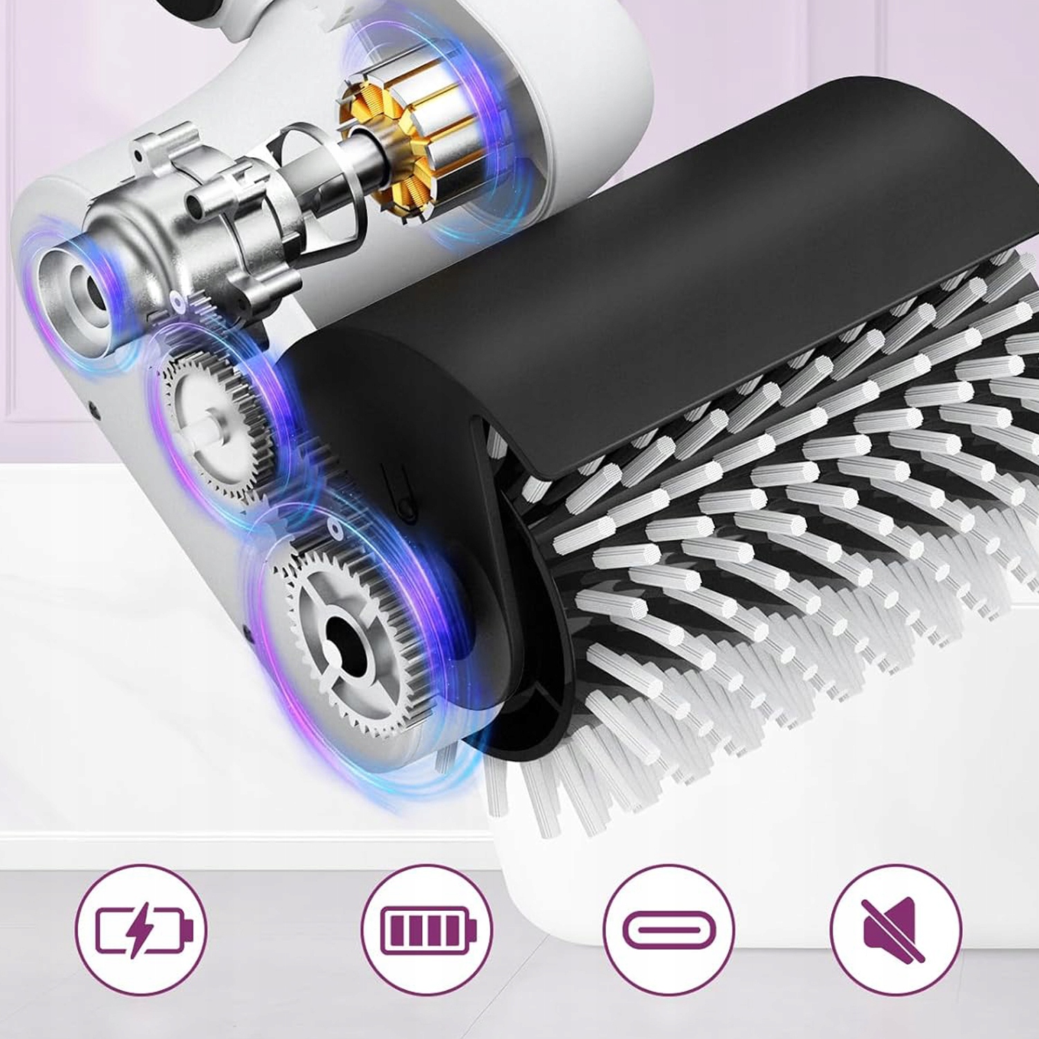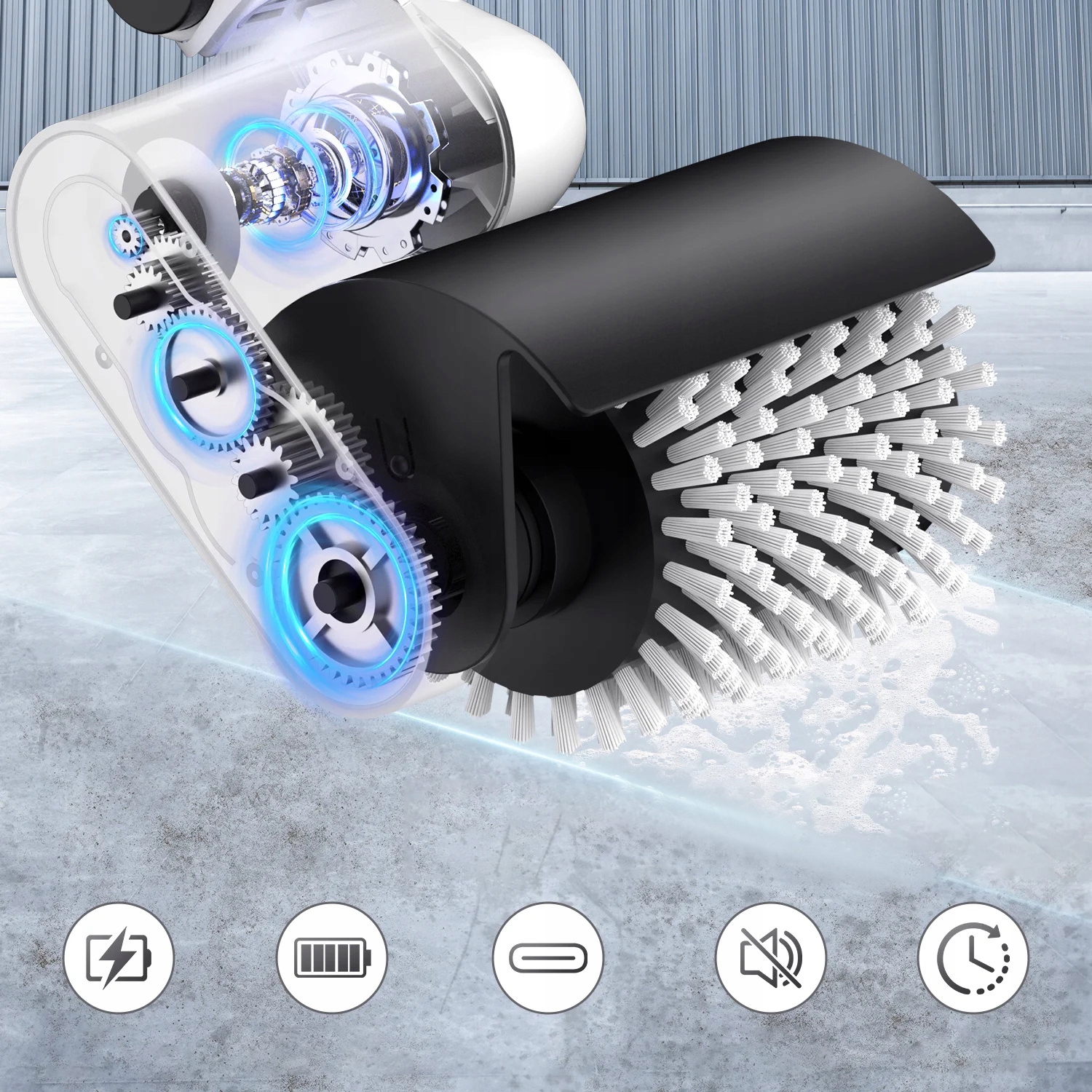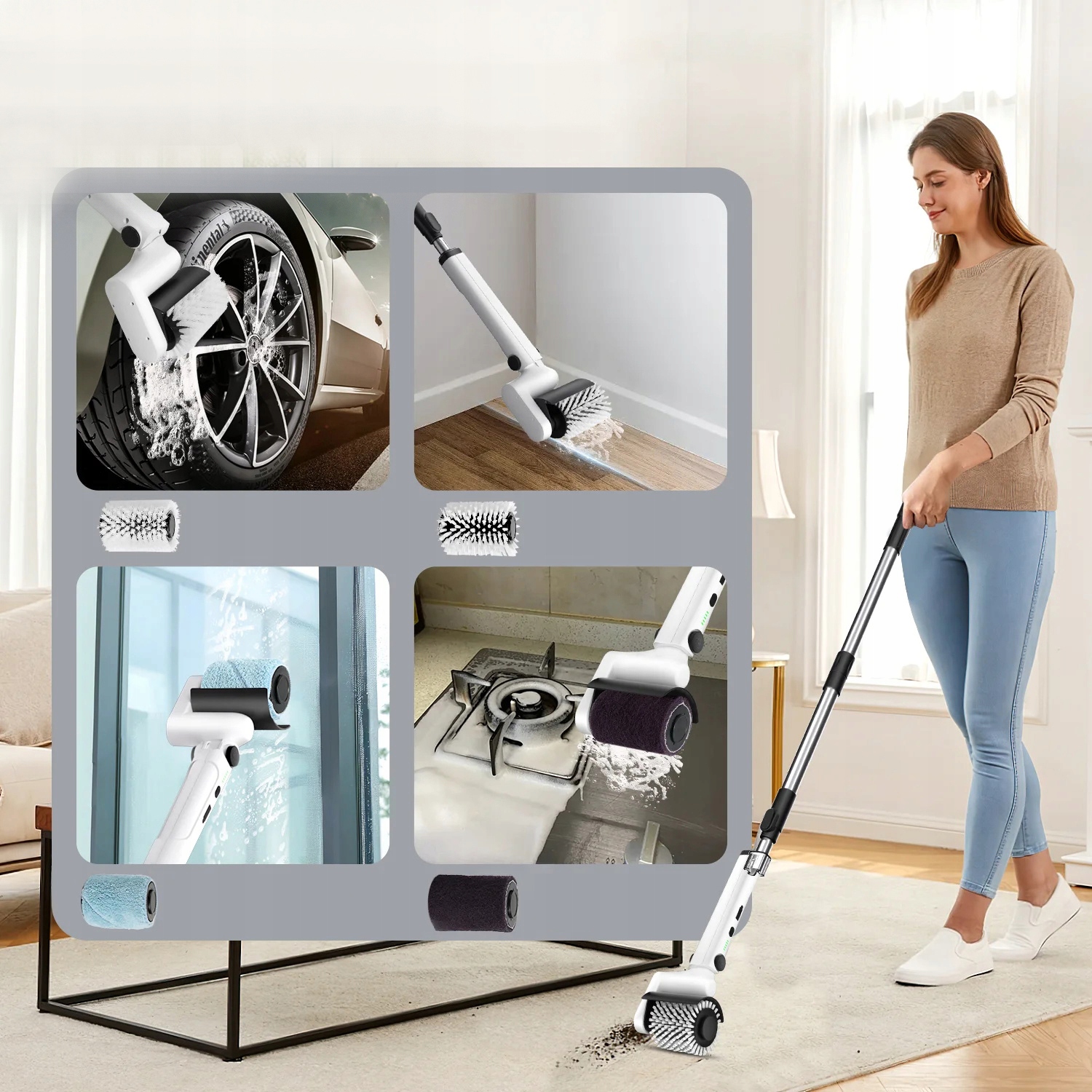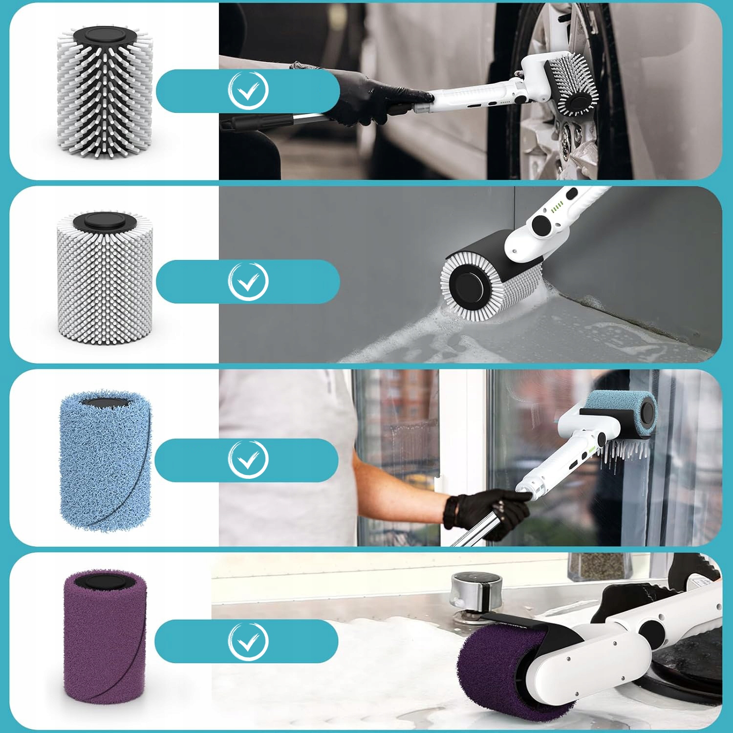 - оснащен 4 сменными многофункциональными щетками, твердой кистью, мягкой кистью, плюшевым абразивным валиком и очищающим роликом, который можно использовать для очистки различных поверхностей, подходящих для стекла, плиток, автомобилей, колес и т. Д.