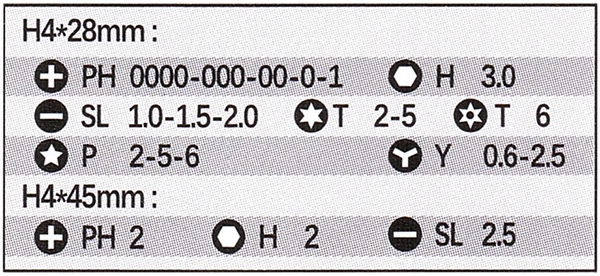 - включает 20 популярных бит из стали S2 с длина 28 и 45 мм, с магнитом,