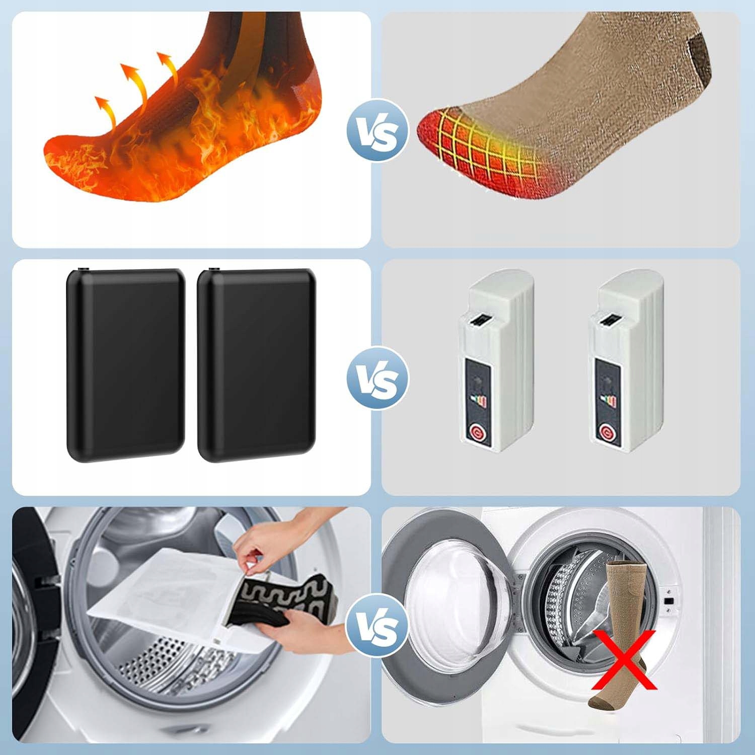 - - носки с подогревом изготовлены из безопасного материала. Дышащий, быстросохнущий, специально разработанный огнестойкий хлопок позволяет чувствовать себя в большей безопасности во время использования. Что еще более важно, дальние инфракрасные нагревательные элементы носков с подогревом могут стимулировать кровообращение. - Можно стирать, ручную и машинную стирку, перед стиркой извлеките аккумулятор, положите носки в мешок для стирки (во избежание поломки зарядного кабеля).