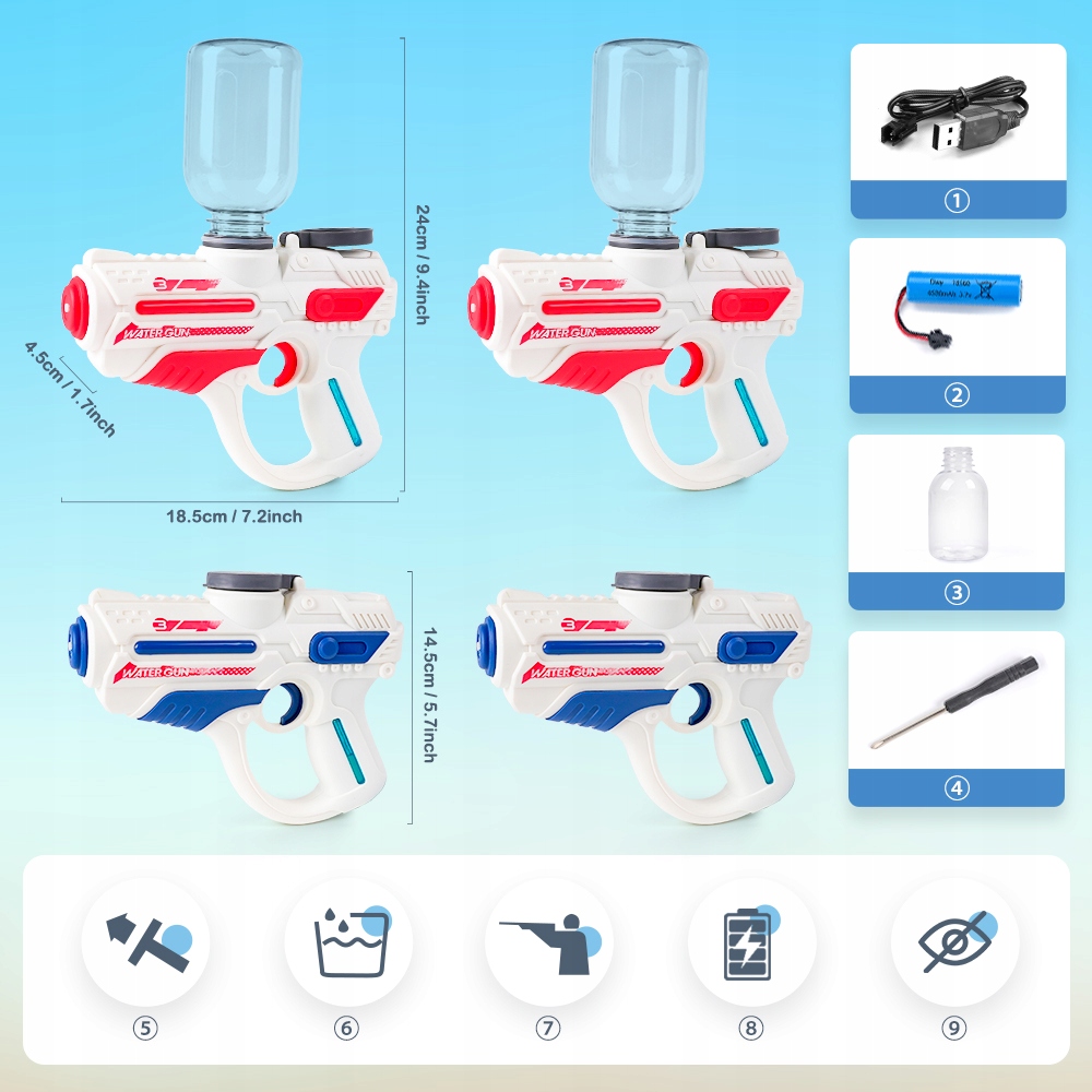 - ⭐В комплект наших водяных пистолетов входят 4 бутылки по 200 мл, 4 аккумулятора, 4 отвертки и 4 зарядных устройства USB.