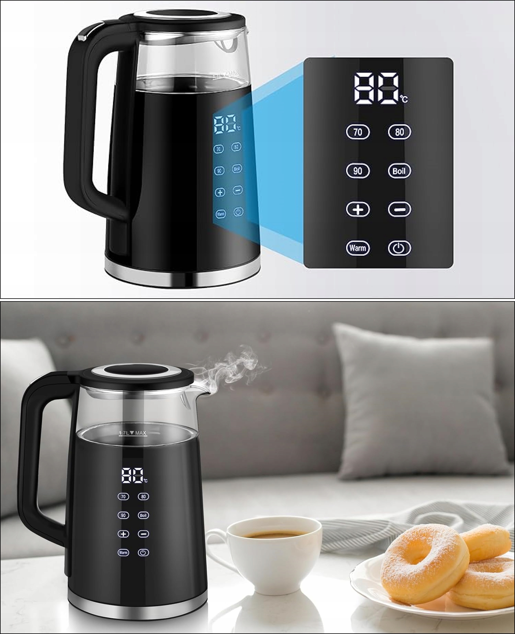 Функция KEEP WARM поддерживает температуру воды и позволяет чайнику автоматически включаться, когда температура воды падает ниже заданного уровня. Когда температура воды падает примерно на 5 градусов, чайник автоматически ее нагревает.