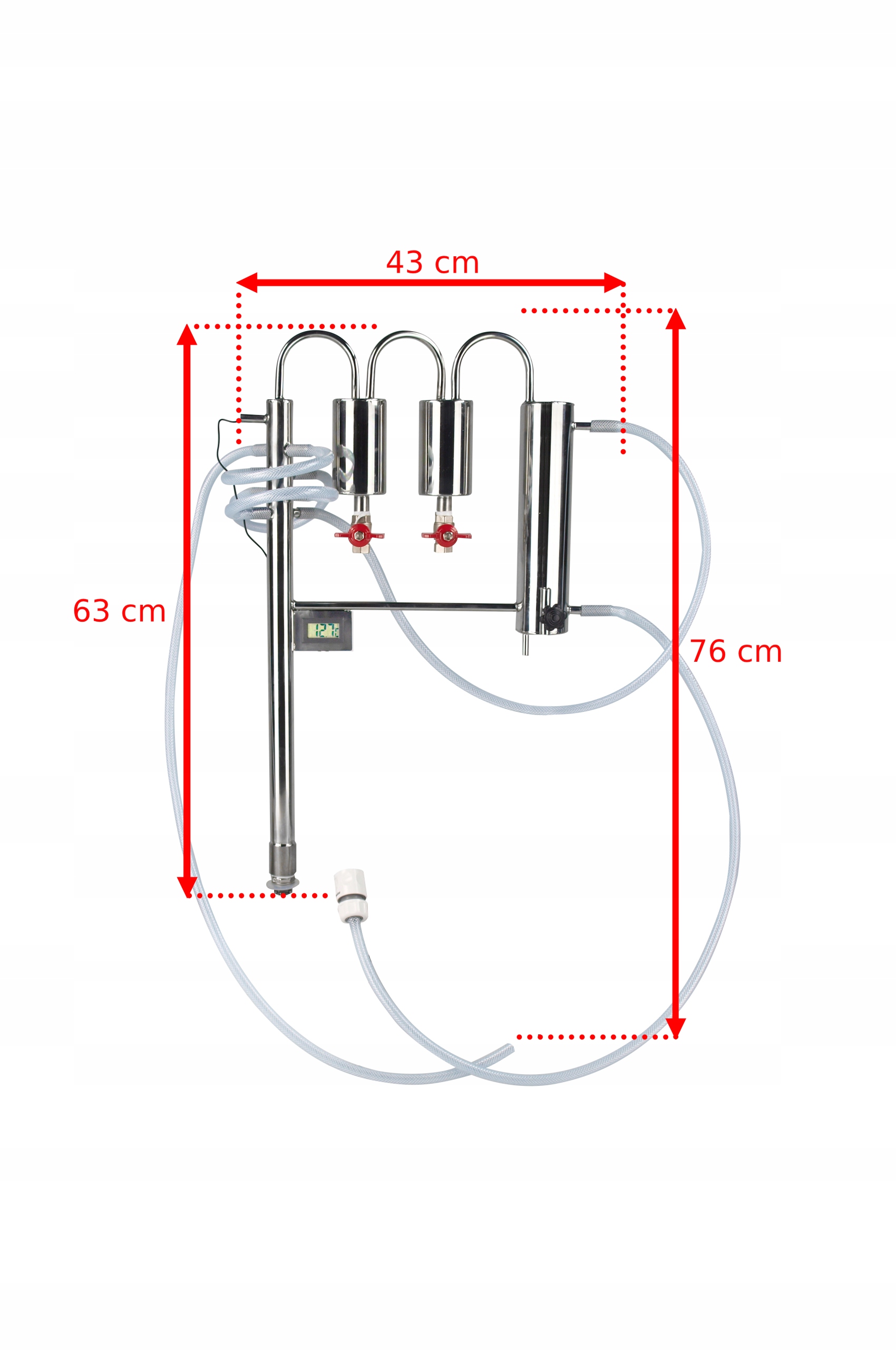 Прецизионный электронный термометр — вставьте датчик в верхнюю часть колонки. Благодаря использованию термометра мы имеем полный контроль над температурой паров, поступающих в охладитель, что позволяет нам легче регулировать мощность конечного продукта. Это очень важно в случае колонны с обратным холодильником.