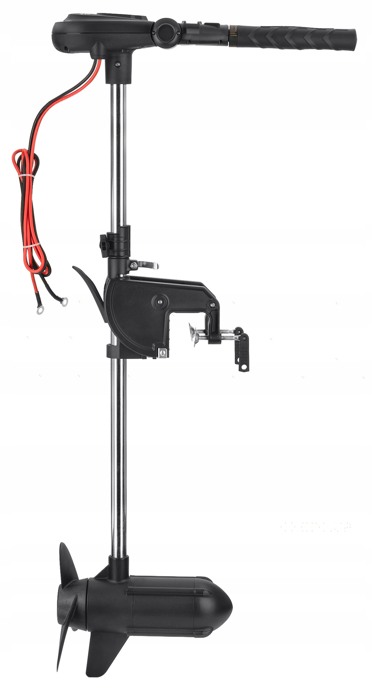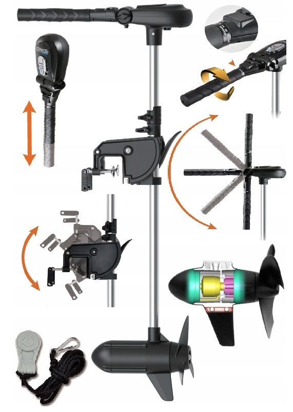 Двигатель оснащен телескопическим румпелем с регулируемой длиной от 24 до 40 см. Возможность регулировки ручки до 180° обеспечивает комфортное управление во время плавания. Передвигая рукоятку вниз до упора, двигатель складывается в удобное транспортное положение.