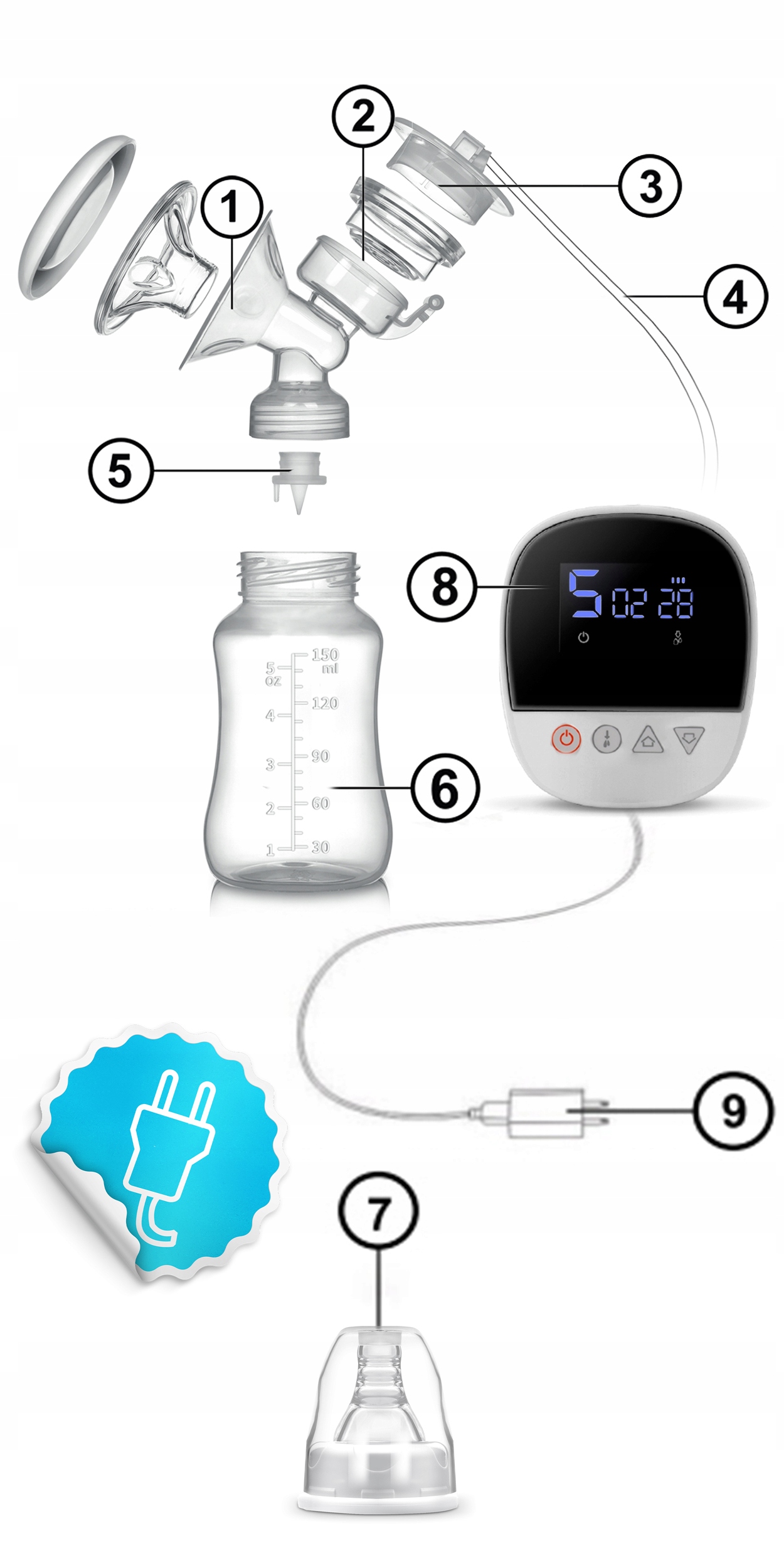 ✅ Вы заряжаете молокоотсос так же, как мобильный телефон! Вы можете зарядить его от сети, подключив к розетке, или через USB-кабель, например, подключив к ноутбуку.
