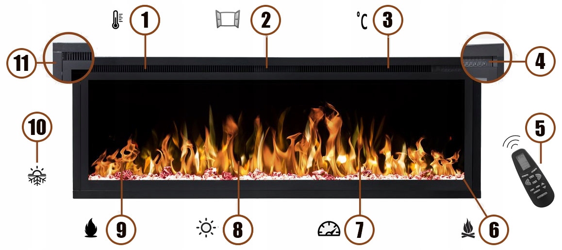 - Пульт дистанционного управления- очень удобно удобное решение, позволяющее управлять всеми функциями камина с дивана или кресла.
