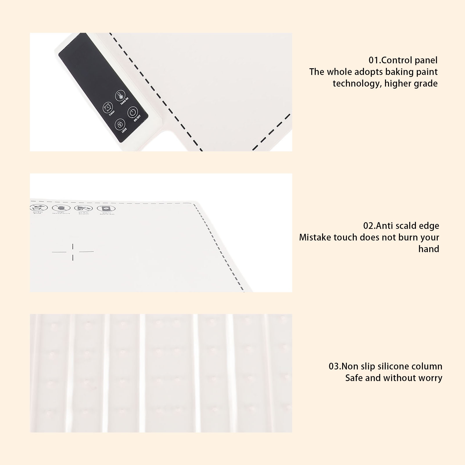 3. Нагревание всей поверхности: используя технологию микроэгрессии, вся силиконовая панель этого коврика быстро нагревается и создает трехмерный эффект изоляции в контакте с посудами, обеспечивая легкое нагрев для комфорта żojek. Большая панель размером 38 x 38 см может нагреться от 1 до 4 сосудов одновременно.