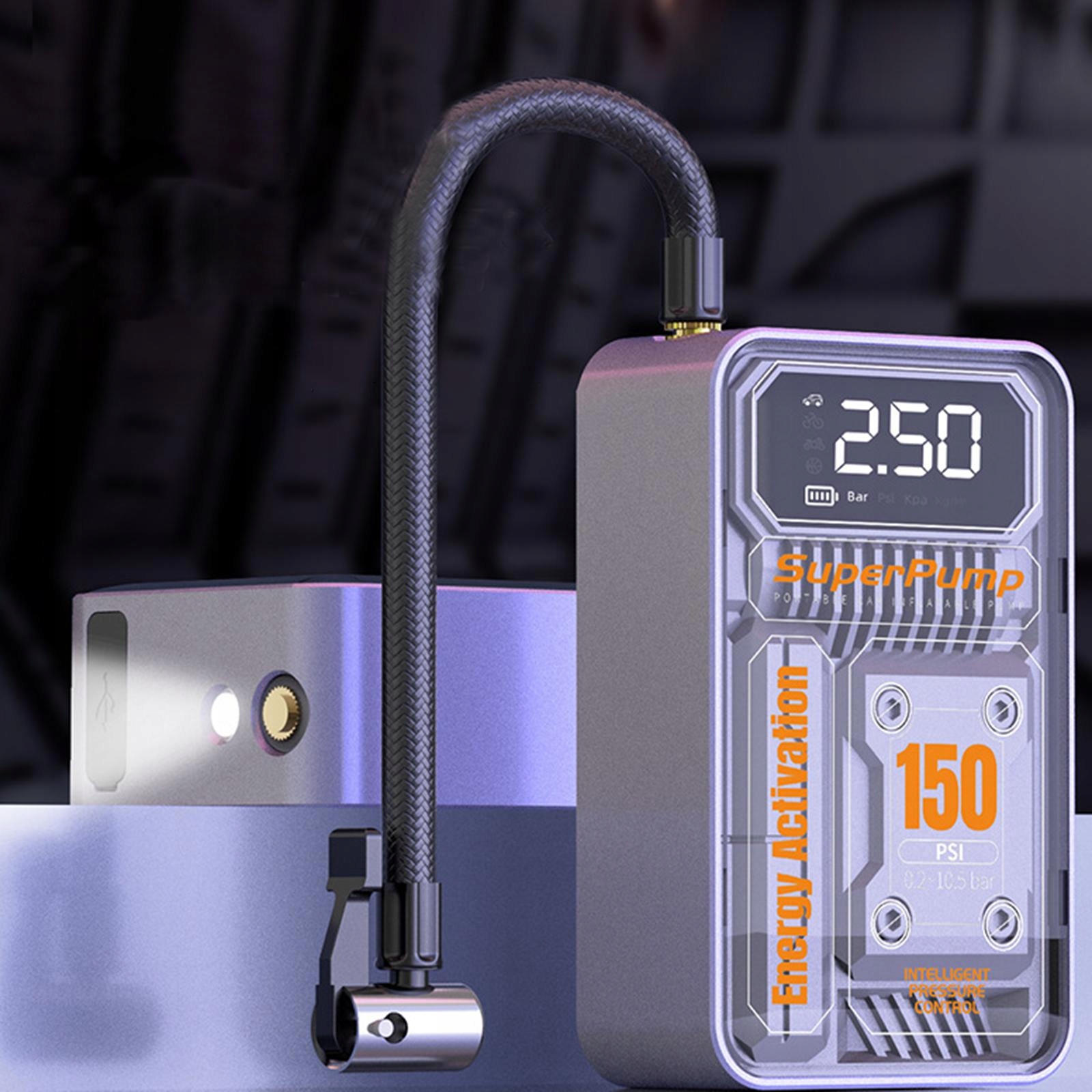 [Светодиодная лампа]: электрический насос для накачивания шин с функцией светодиодного освещения, удобный ночью и при слабом освещении.