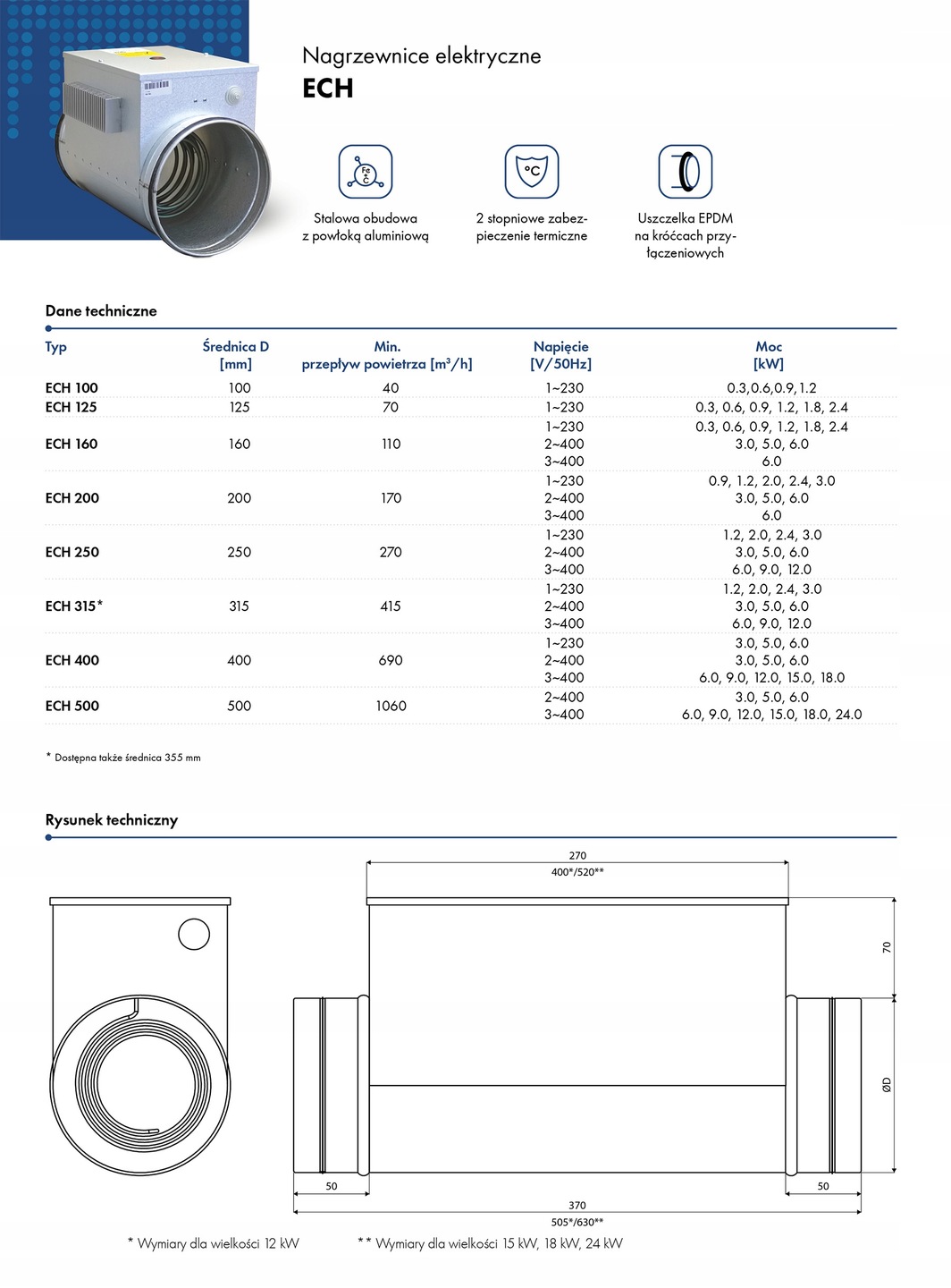 ECH – электрический канальный обогреватель без встроенной автоматики. Мощность обогрева обогревателя можно регулировать с помощью внешнего регулятора HRK. Обогреватели ECH предназначены для установки в воздуховоды круглого сечения. Они выпускаются с типичным диаметром вентиляции от 100 до 500 мм и мощностью от 0,3 до 24,0 кВт.