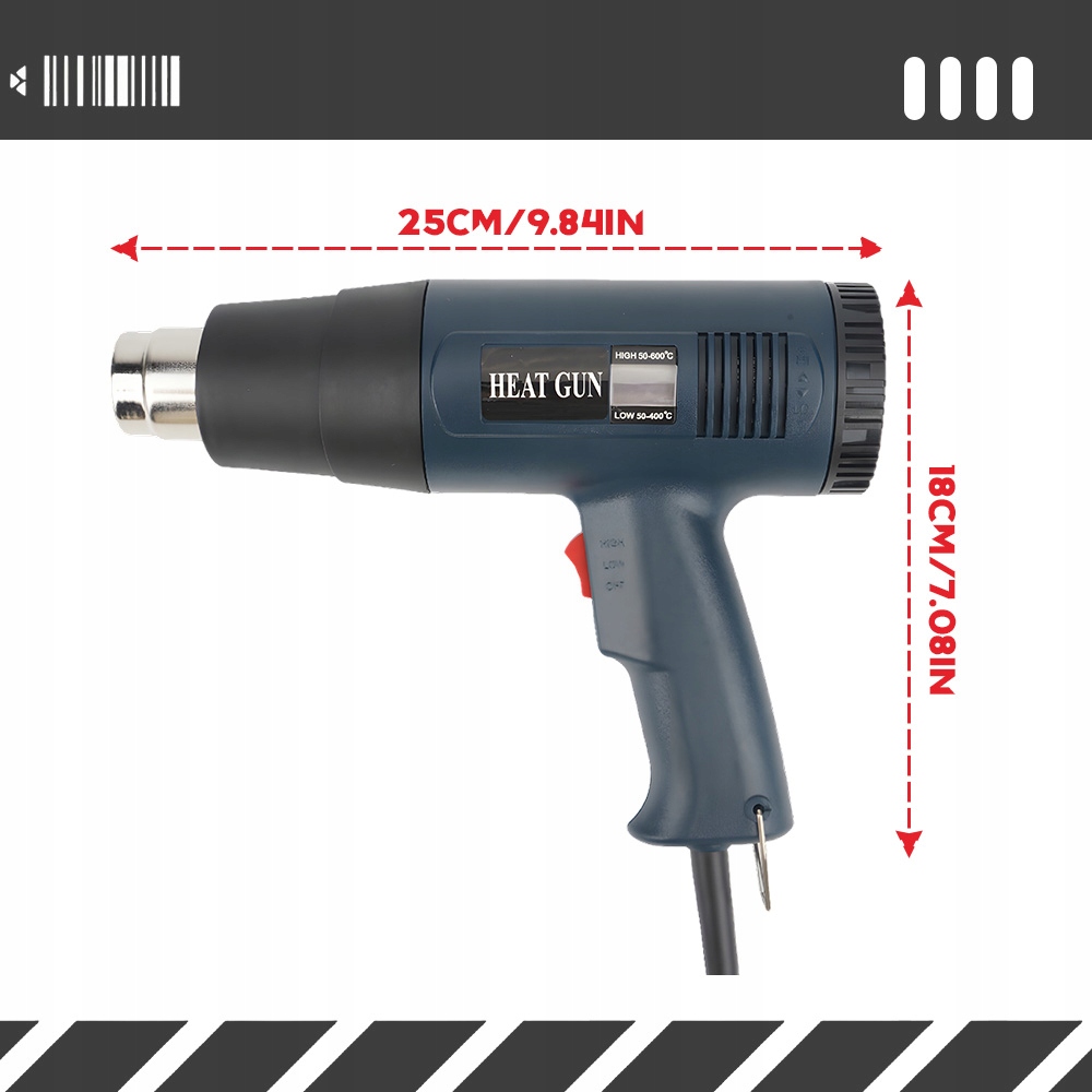 Горячий воздушный пистолет предлагает различные настройки температуры. Использует два высокотемпературных нагревающих кабеля для быстрее нагревания и быстрее нагреваться. Оснащенный защитой от перегрузки контроля температуры, имеет длительный срок службы.