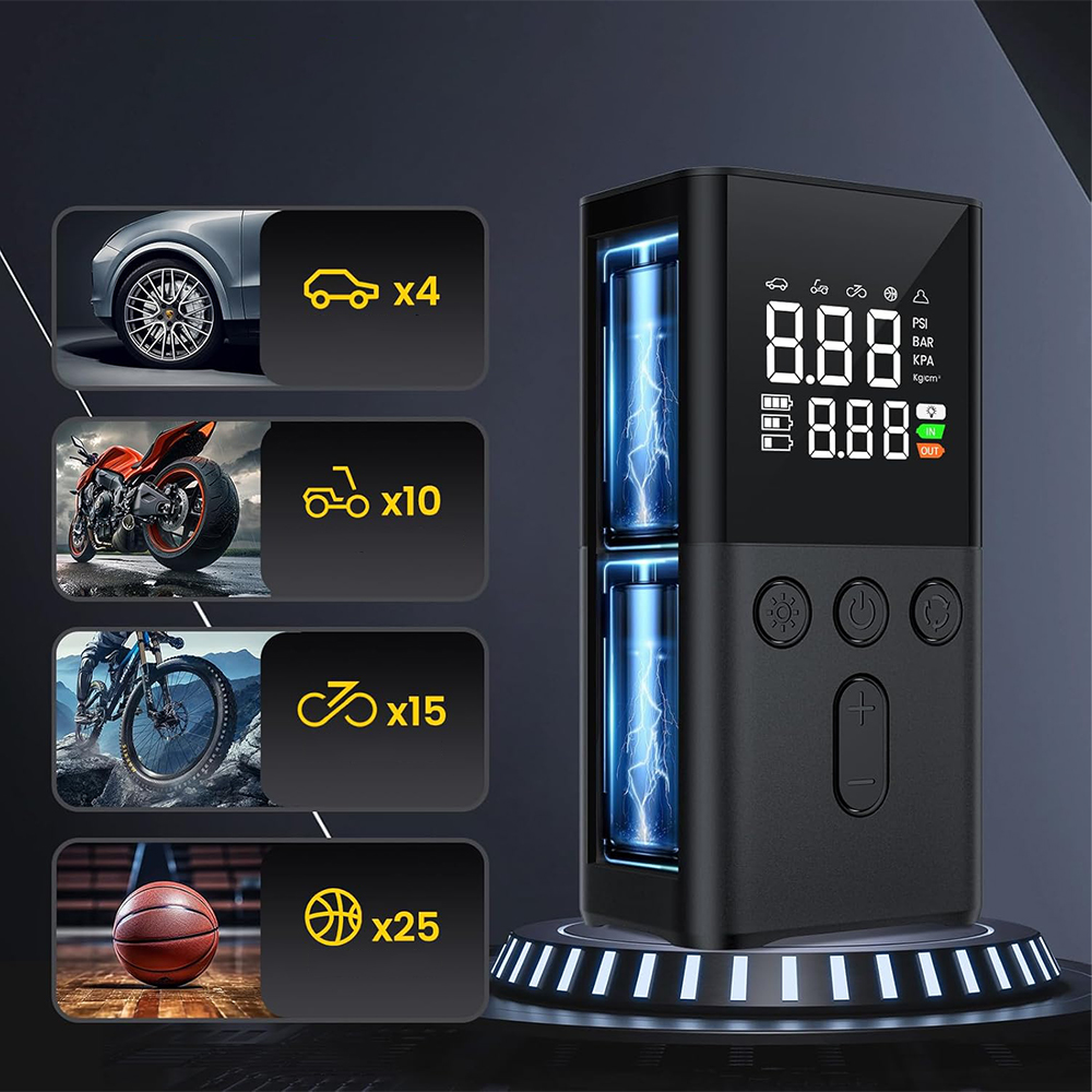 Давление воздуха воздушного насоса электрическое воздух может достигать 150 фунтов на квадратный дюйм, что позволяет надувать шины (размер 195/55// R15) от 29 кв. Дюймов до 36 фунтов на квадратный дюйм всего за одну минуту; Раздуть шину (размер 195/55/R15) от 0 до 36 фунтов на квадратный дюйм в течение 8 минут; Надуть мотоциклетные шины в течение четырех минут; Надуть велосипедные шины за одну минуту; Сила разных шаров за 50 секунд. Быстрая перекачка в кратчайшие сроки и сэкономить время. Имеет четыре режима операции, которые могут перекачивать автомобили, мотоциклы, велосипеды и баскетбольные шарики; Вы можете выбрать четыре манометра для велосипедных насосов: PSI Bar, KPA, кг/см². Кроме того, электрический воздушный насос может использоваться не только в качестве насосного воздушного насоса, но и в качестве портативного источника питания для зарядки электронных устройств. /b>