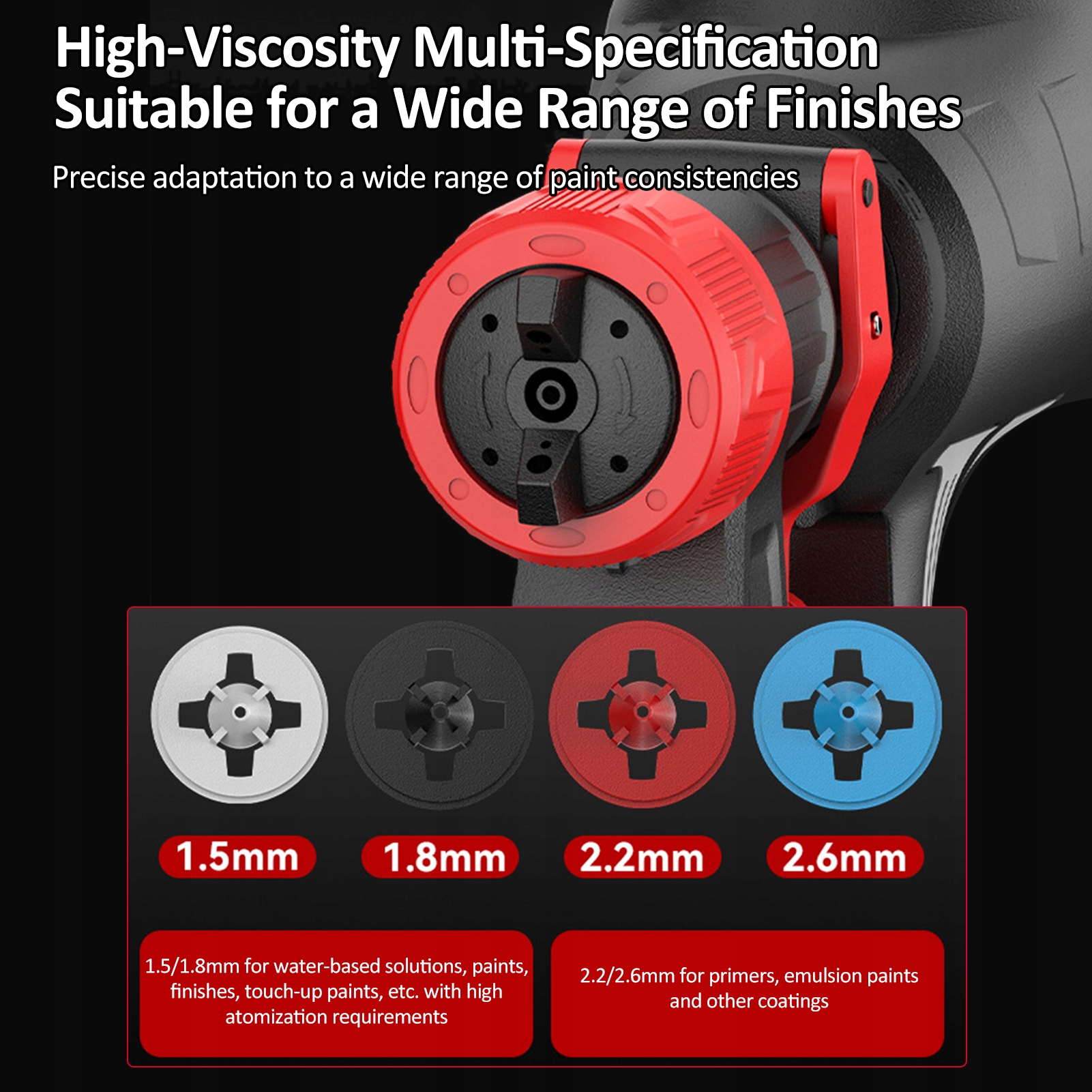 4. 4 сопла: использование высококачественных сопел, более износостойких, коррозионностойких и высококачественных. Оснащен четырьмя типами насадок 1,5/1,8/2,2/2,6 мм для удовлетворения различных потребностей в распылении.