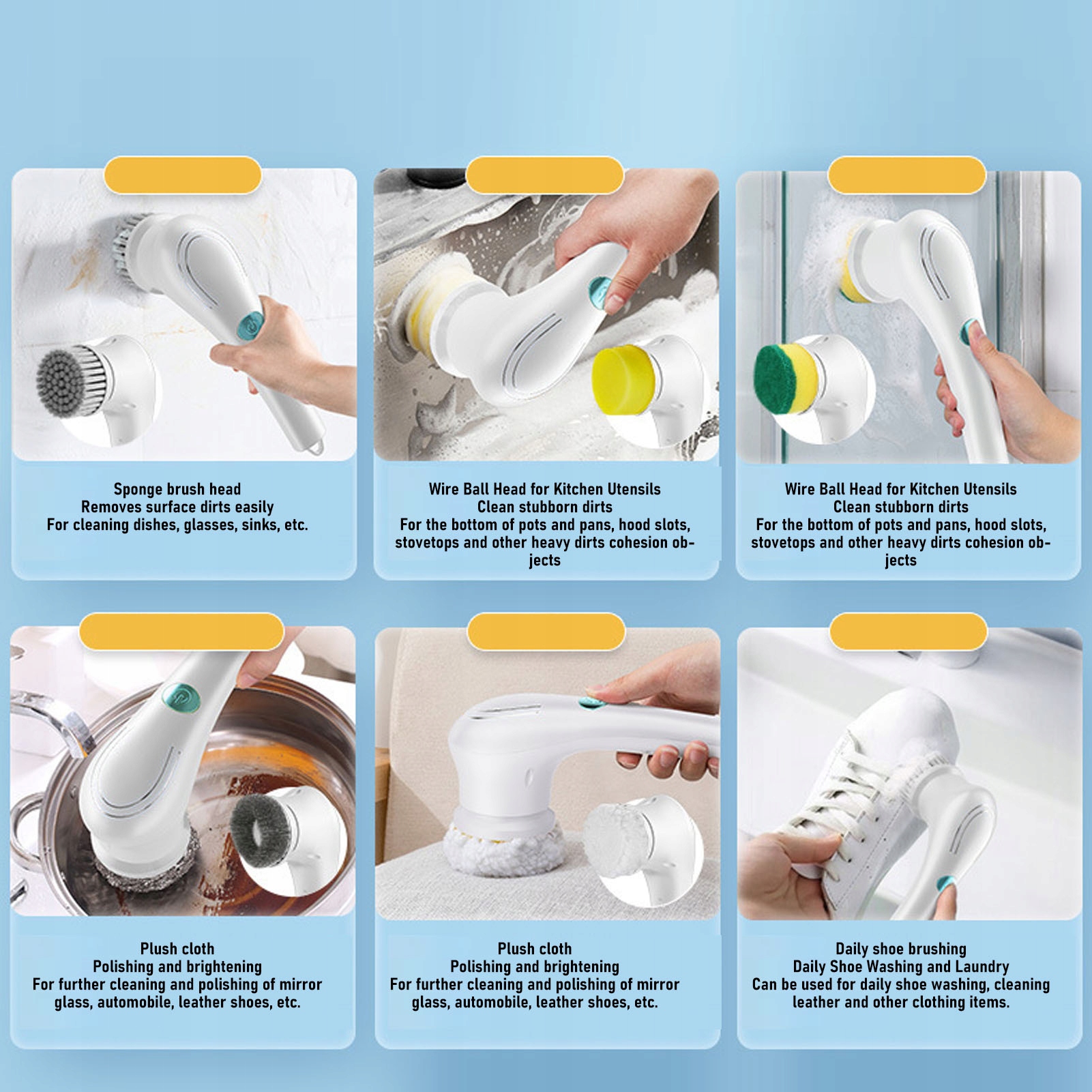 2. Универсальные головки кистей для всех потребностей очистки: оснащены 5 различными головками кистей, этот скруббер был разработан для решения различных задач очистки, предоставляя подходящий инструмент для каждой работы.