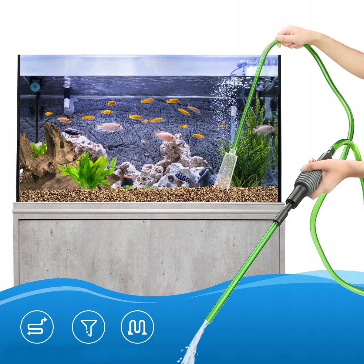 - Легкая установка: Аквариум -гравийный вакуумный очиститель можно легко собрать и демонтировать без использования инструментов. Подключите впускной и водопровод и поместите его в аквариум. Чтобы слить воду, просто нажмите насос вручную.
