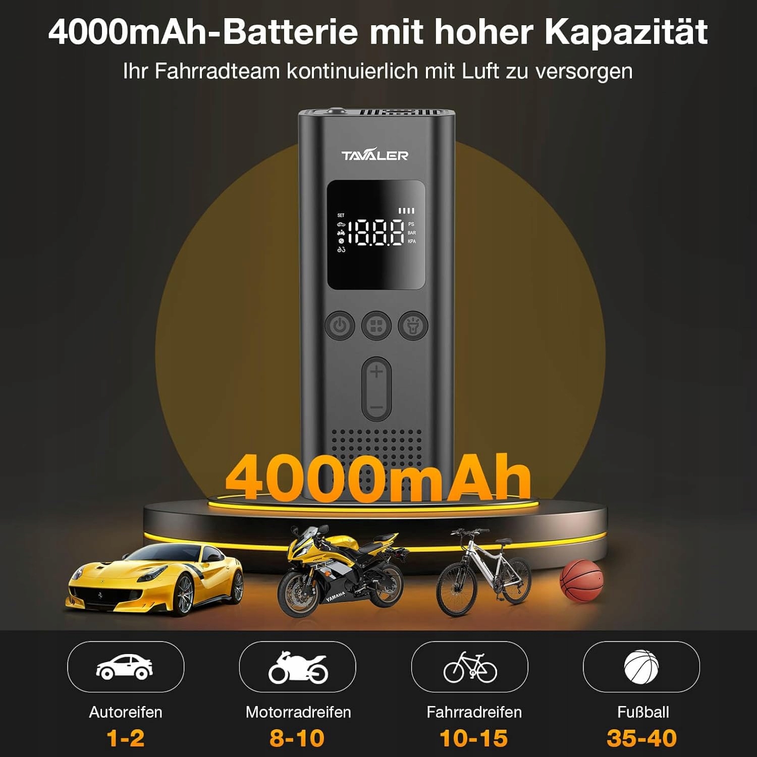 - Электрический воздушный насос Tavaler быстро повышает давление воздуха в автомобильных шинах с 1,93 бар до 2,3 бар (от 28 до 34 фунтов на квадратный дюйм) менее чем за минуту (спецификация: 175/65R14 82T), а в шинах шоссейных велосипедов менее чем за 2 минуты до 100 фунтов на квадратный дюйм при мощности до 150 фунтов на квадратный дюйм.
