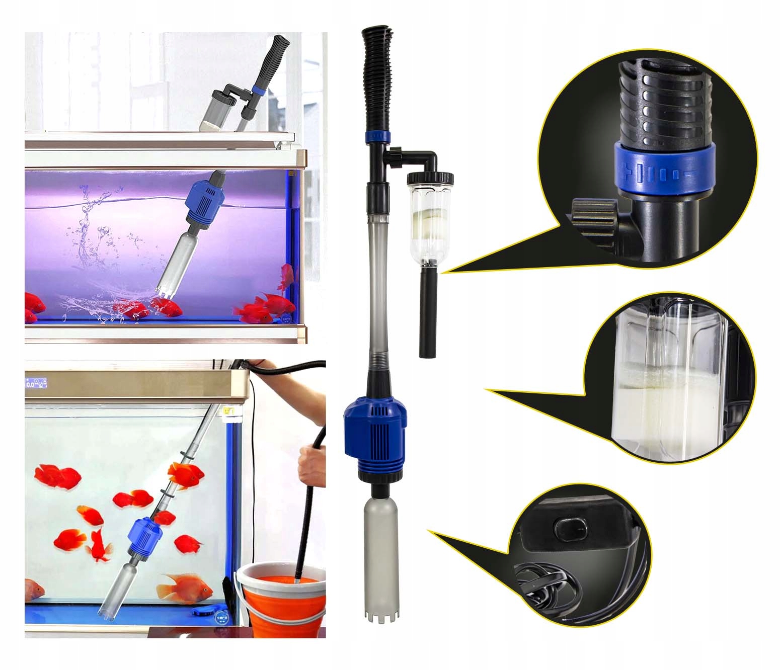 - Многофункциональность: чистка субстрата , фильтрация примесей из воды, слив грязной воды из бака и замена ее чистой водой.