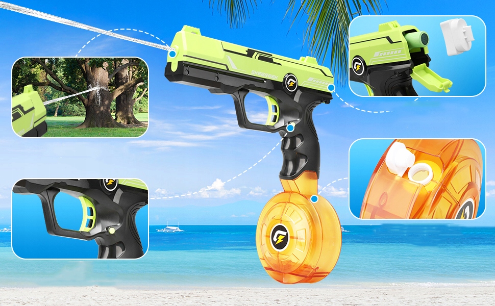- Этот мощный водный пистолет идеально подходит для занятий на открытом воздухе, на пляже, песке, в бассейне и на мероприятиях, что обеспечивает бесконечное веселье.