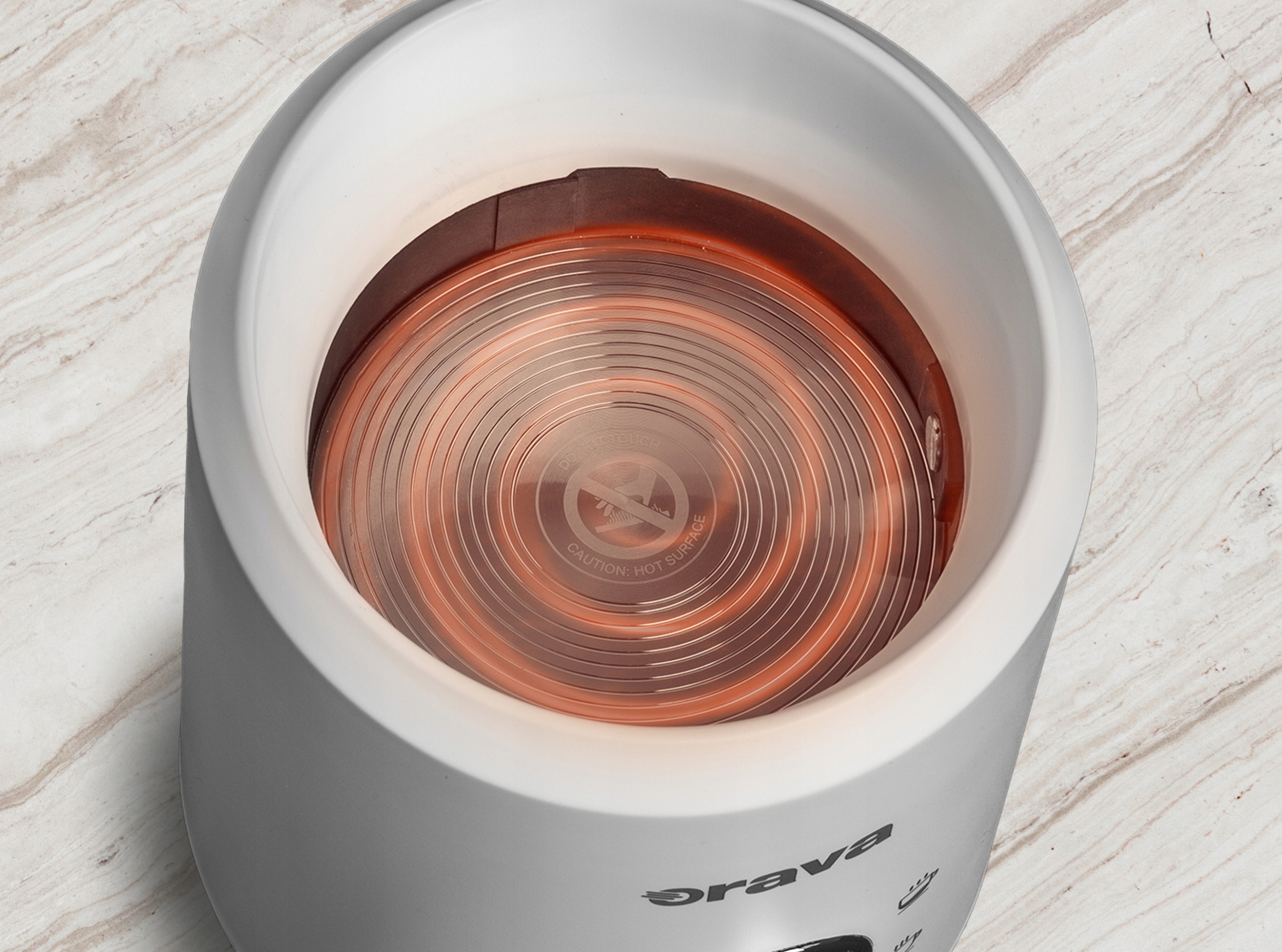 Нагревательное основание с закрытой нагревательной спиралью обеспечивает быстрый и эффективный нагрев молока без риска перегрева. Эта спираль разработана для обеспечения безопасности и оптимальной производительности, каждый раз гарантируя безупречные результаты.