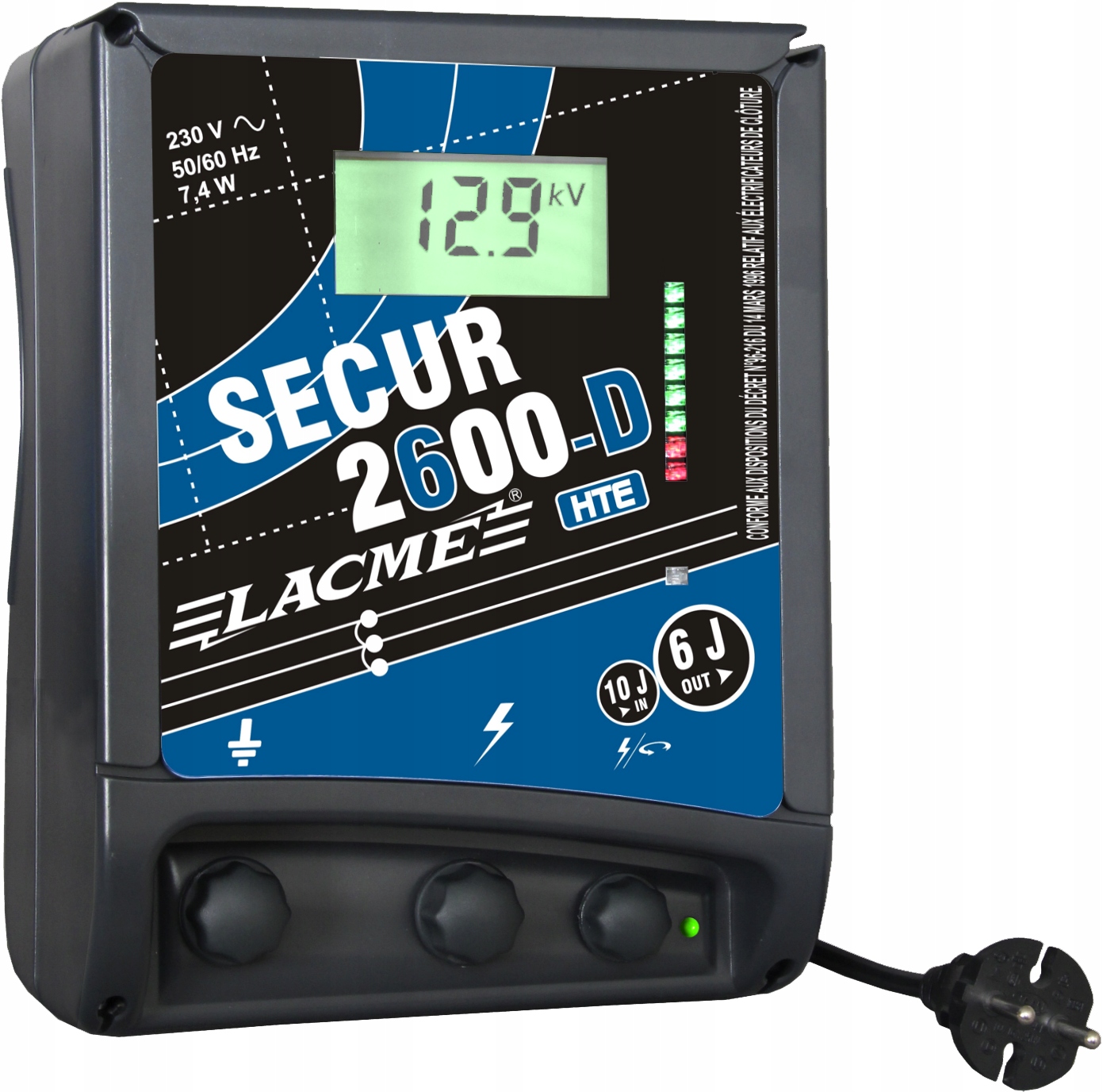Сетевой блок питания очень высокой мощности для использования в экстремальных условиях: длинные заборы, участки, покрытые растительностью, особо агрессивные животные. С целью повышения эффективности работы здесь была использована технология HTE, повышающая эффективность производства энергии и напряжения. Кроме того, индикаторы позволяют контролировать правильную работу обратного контура ограждения.