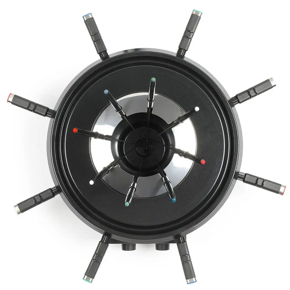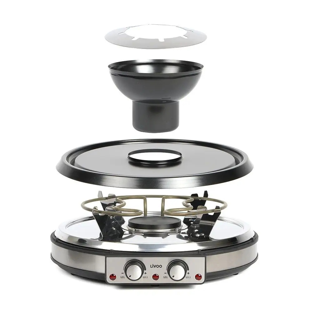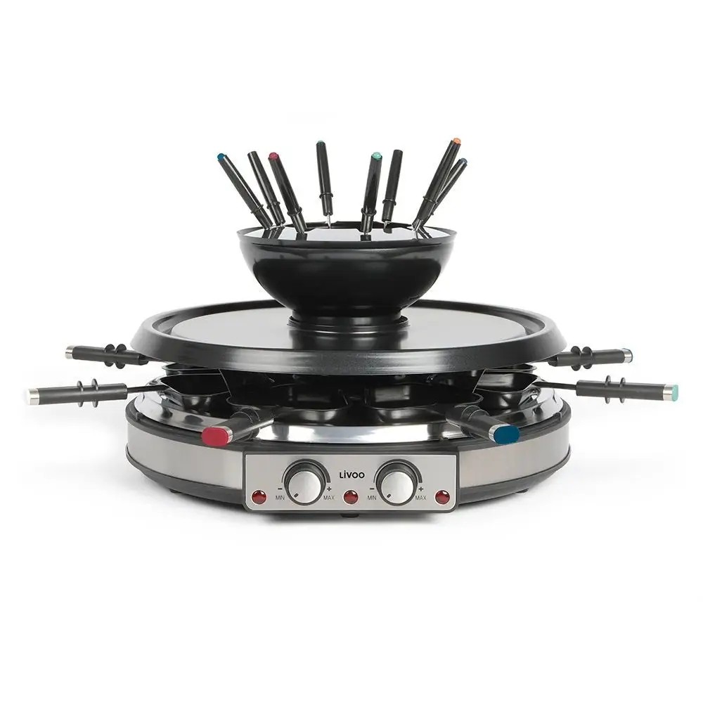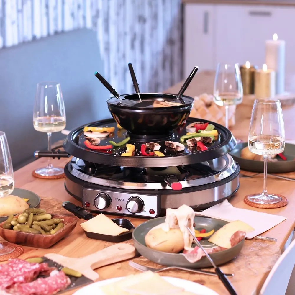 Универсальный прибор для разнообразного и сытного обеда в кругу друзей и семьи: раклет-гриль и фондю от французской компании Livoo. В центре этой универсальной конструкции находится кастрюля для фондю емкостью 0,7 л. Прекрасные сырные соусы с хлебом или сладкое шоколадное фондю с фруктами расширят ваши кулинарные вкусовые ощущения. Практичная крышка удерживает 8 вилок для фондю из нержавеющей стали в положениях, имеющих цветовую маркировку для удобства. Мощность нагрева 1900 Вт обеспечивает быстрый нагрев аппарата «Фондулет». Два отдельно регулируемых термостата для функций раклета и фондю. Съемная пластина для гриля и элементы для фондю облегчают очистку устройства.