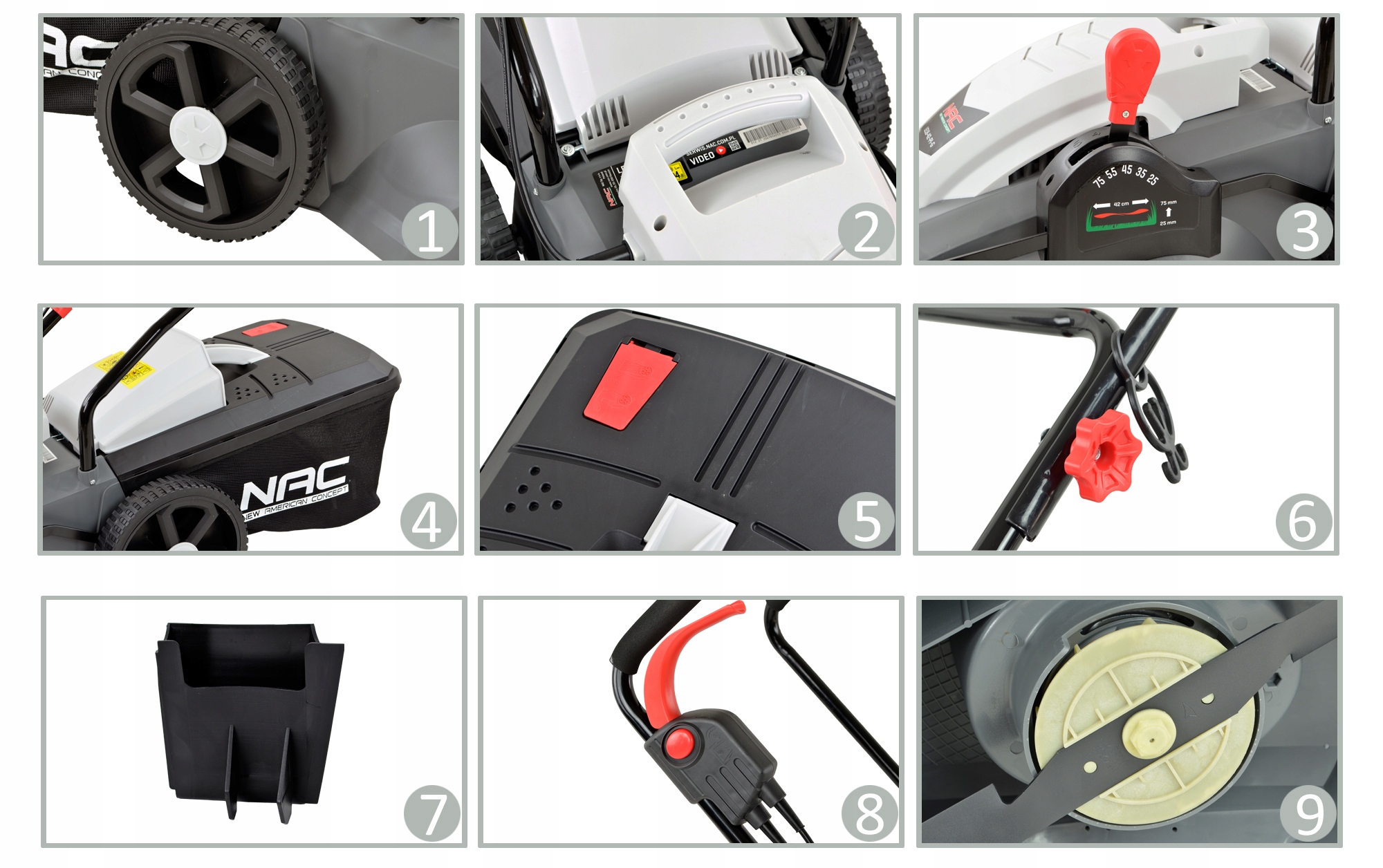 Это версия с корзиной, оснащенной пылезащитной крышкой и индикатором наполнения, емкостью 50 литров. Он имеет 5-ступенчатую центральную регулировку высоты стрижки в диапазоне от 25 до 75 мм. (Поднимаем или опускаем все четыре колеса одновременно с помощью одного центрального рычага.)