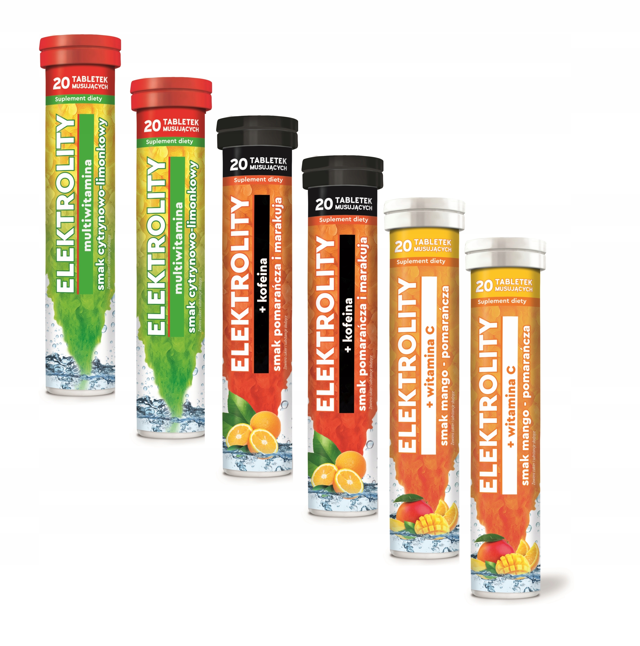Электролиты + кофеин содержат: глюкозу, натрий, калий, витамин С, витамин В6 и кофеин. Шипучие таблетки после приготовления создают гидратирующий раствор, подходящий при физической активности и усталости.