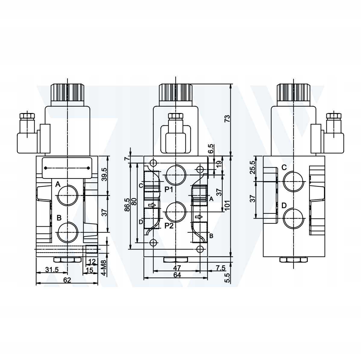Клапан имеет два порта «P1,P2», что обеспечивает его прямое подключение. на два порта с распределительной секцией. Порты C, D подключаются к портам основного исполнительного механизма системы, а порты A, B — к дополнительному исполнительному устройству.