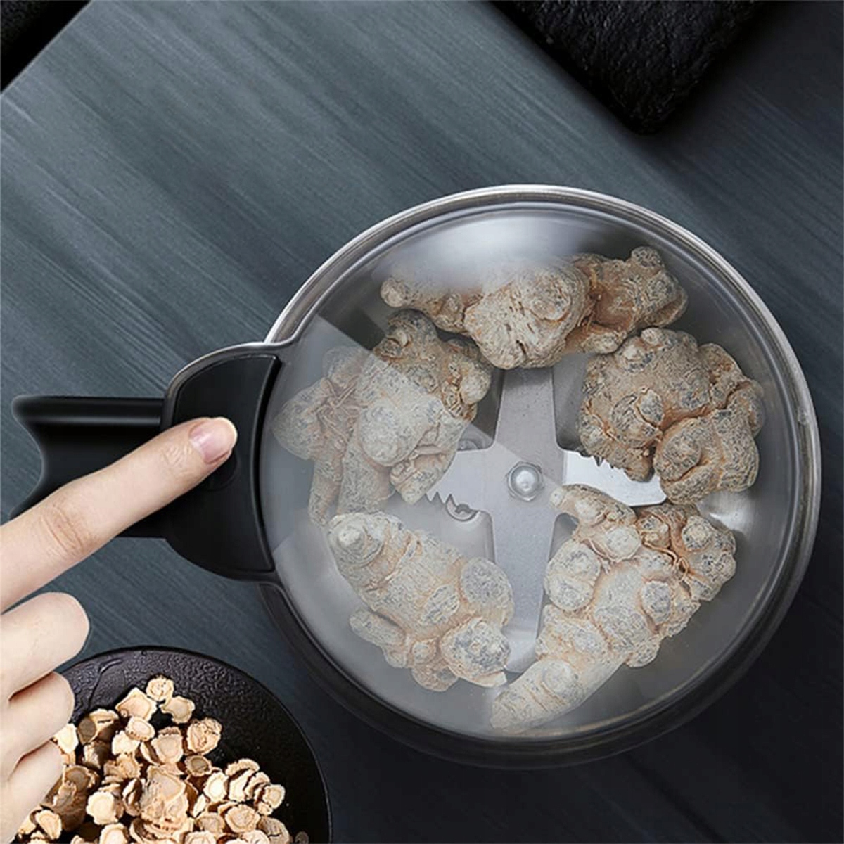 Прозрачная крышка позволяет наблюдать за процессом измельчения и получать крупный или мелкий порошок. Производительность помола: примерно от 50 г до 200 г на партию. Уровень помола можно регулировать, используя разные партии.