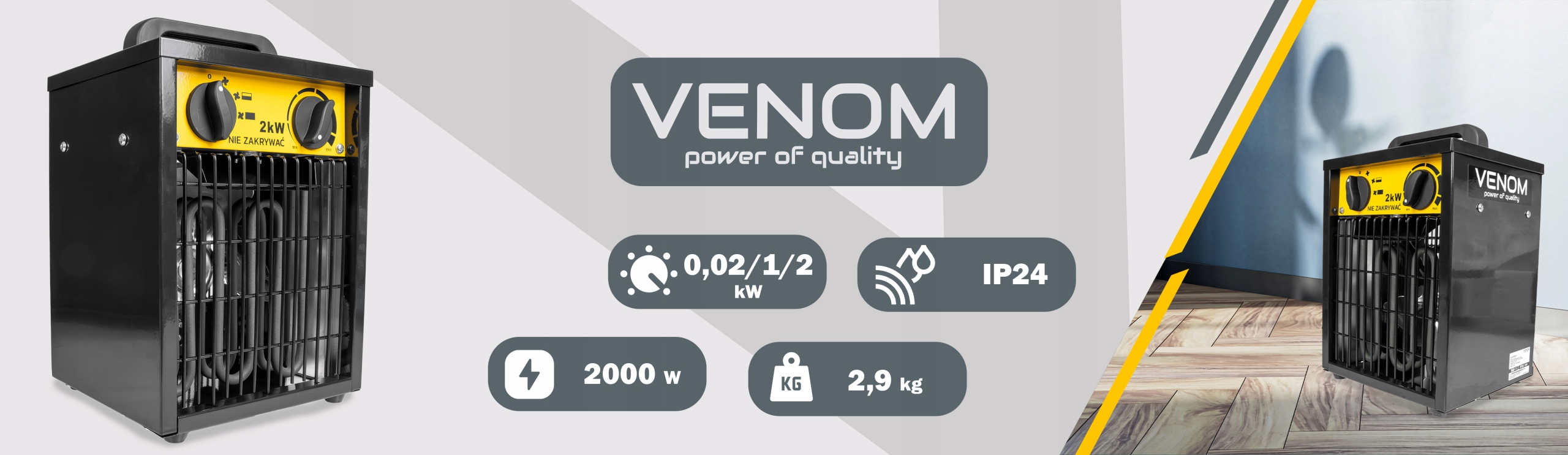 ✅ VENOM HeatFlow 2000™ - электрический обогреватель мощностью 2000 Вт, мгновенно повышающий температуру в помещении, обеспечивая быстрый тепловой комфорт.