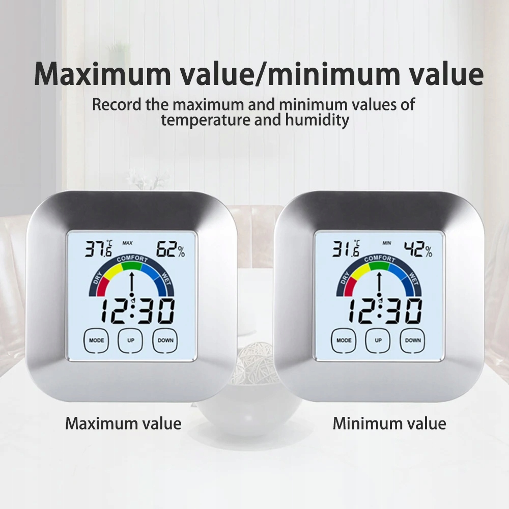 Дисплей: Максимальная/минимальная температура и влажность, время и будильник
