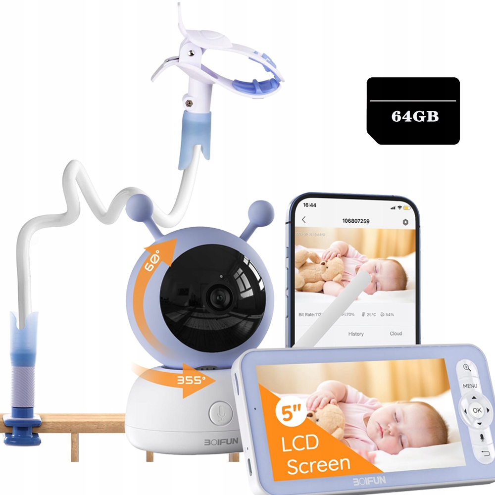 5-дюймового интеллектуального Boifun Nanny поддерживает подключение ЖК-монитора (сигнал 300 м) и мобильное приложение (Wi-Fi требуется).