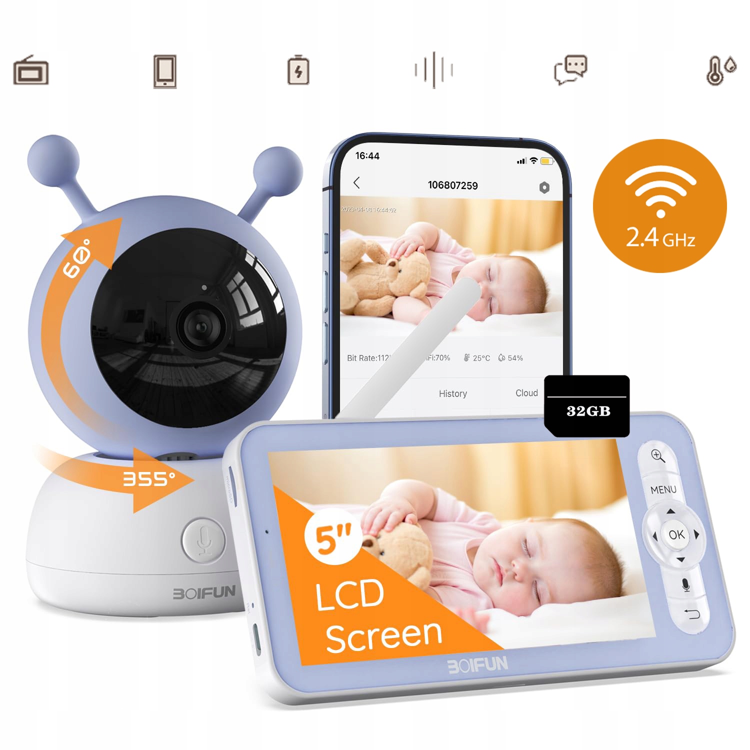 5-дюймового интеллектуального Boifun Nanny поддерживает подключение ЖК-монитора (сигнал 300 м) и мобильное приложение (Wi-Fi требуется).