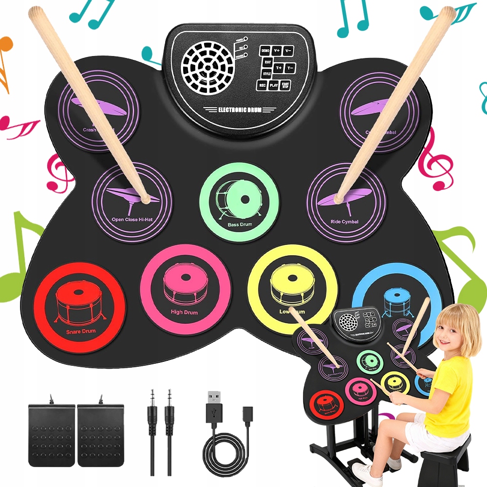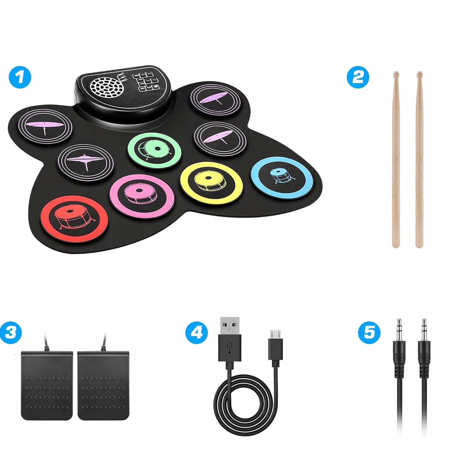 В комплект входят 9 силиконовых пэдов для барабанов (3 полных барабана, 2 тарелки, 1 хай-хет и т. д.), обеспечивающие чистый и совершенный звук, точно имитирующий обратную связь с реальными барабанами. комплект.