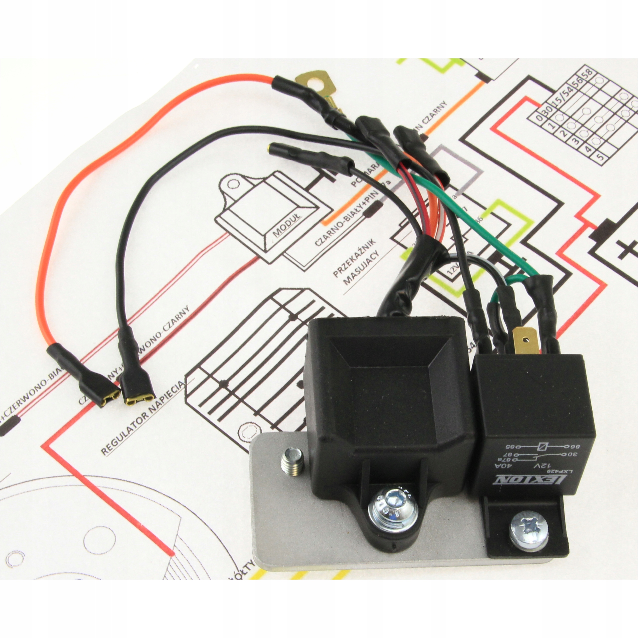 3. Подставка, монтируемая на место оригинального регулятора напряжения с модулем зажигания и массовое реле, позволяющее глушить и запускать мотоцикл с помощью оригинального замка зажигания.