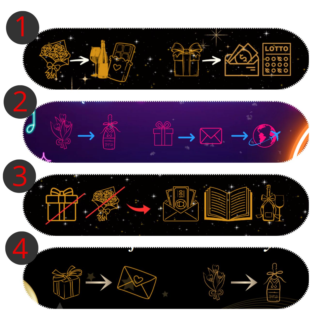 Мы предлагаем возможность добавить персонализированную пиктограмму/графику, которая будет тонко информировать ваших гостей о том, какие подарки они предпочитают. Нежные и элегантные значки сделают ваш запрос понятным и ненавязчивым.