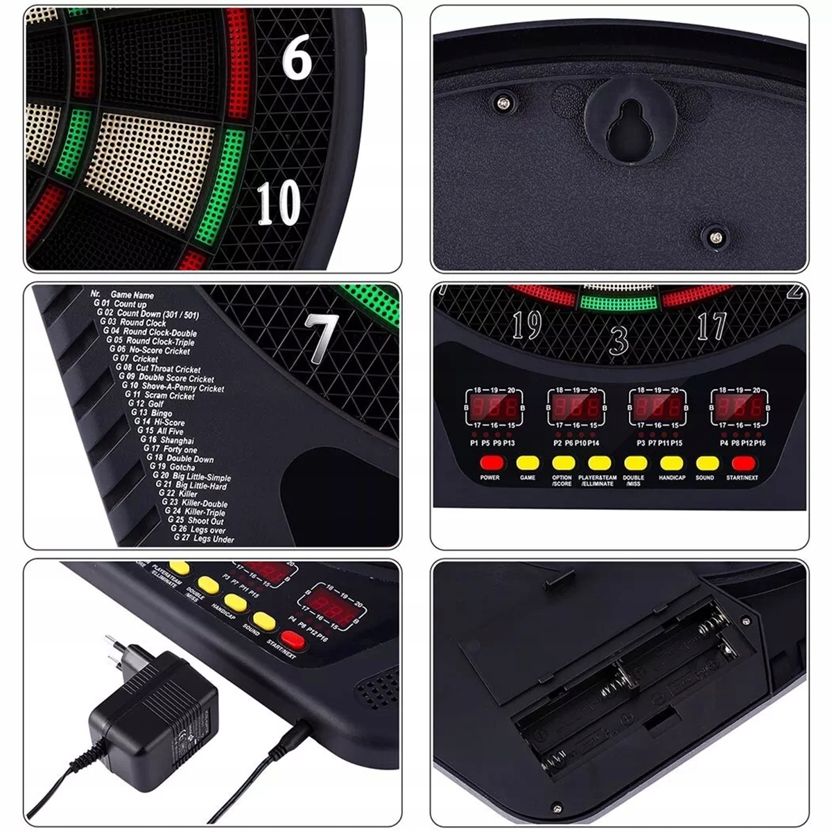 🎯Дартборд оснащен 4 светодиодными индикаторами, автоматически подсчитывает очки и предлагает собственные голосовые подсказки. Это позволяет одновременно играть в командах до 16 человек. Это веселее, чем традиционные дартс.