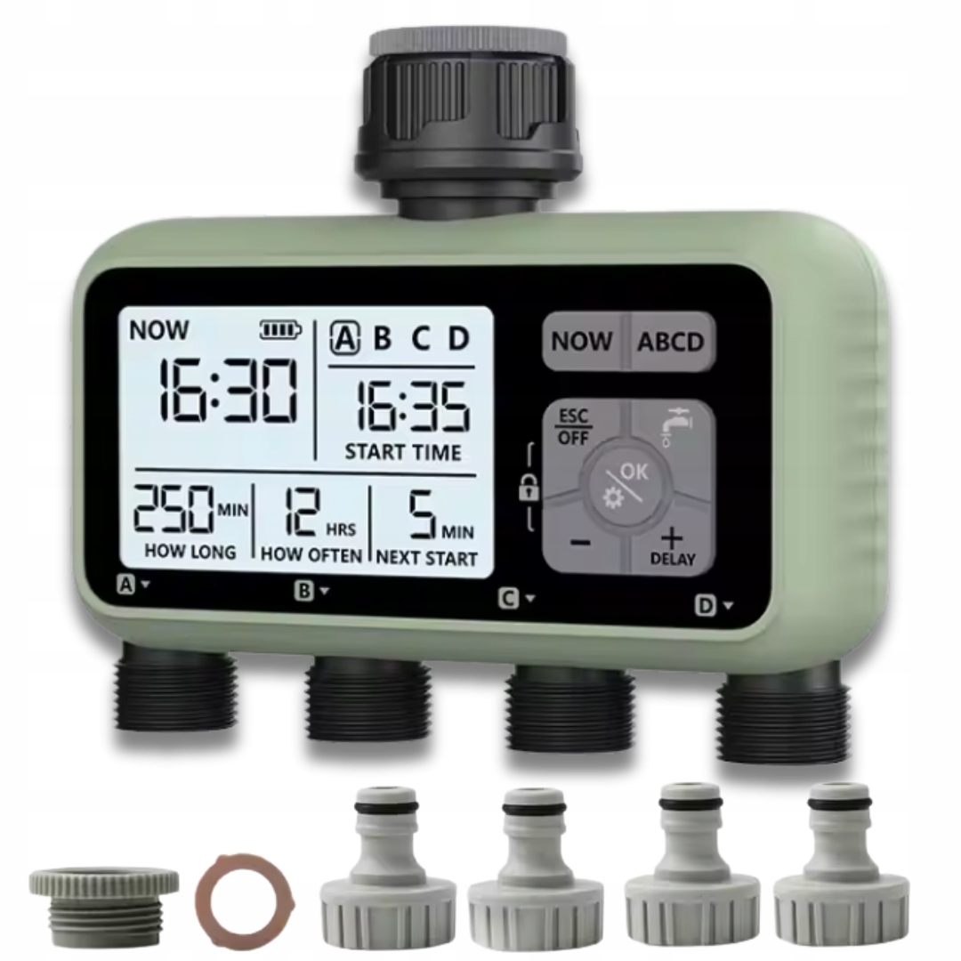 4 Независимые поливные зоны - Контроллер позволяет вам подключать и управлять ирригацией четыре отдельных секция , что позволяет отдельным настройкам для различных областей сада. Вы можете настроить график полива для газона, овощных слоев, кастрюли или декоративных растений, обеспечивая их правильное количество воды. Благодаря этой функции каждая часть вашего сада будет поливать в соответствии с его уникальными потребностями, что значительно улучшает здоровье и внешний вид растений