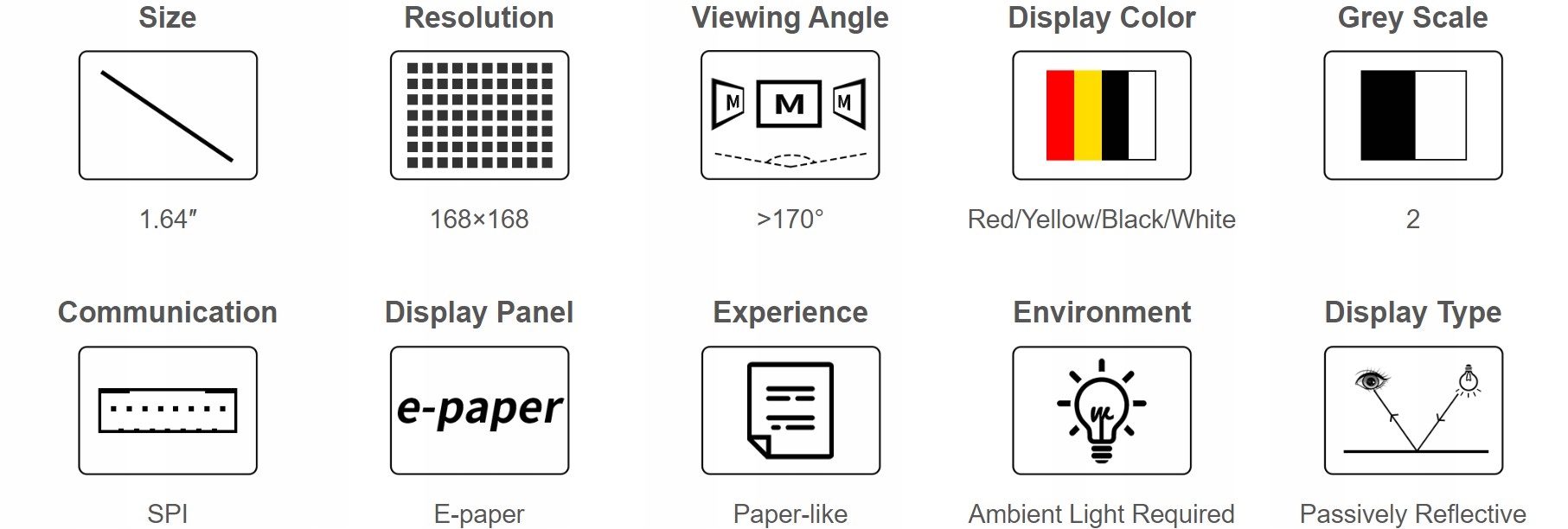 Дисплей для электронной бумаги 168 x 168 пикселей . Его диагональ составляет 1,64 дюйма. Он представляет контент в четырех цветах: красном, желтом, черном и белом. Модуль использует шину SPI для связи с Raspberry Pi. Экран выполнен по технологии E-Ink, что создает у пользователя впечатление чтения с листа бумаги. Этот тип дисплеев можно использовать для чтения электронных книг и электронных журналов. Дисплей не излучает синего свечения и является пассивно отражающим. Представляет последний загруженный контент даже после отключения питания. Он отличается низким энергопотреблением, и мощность расходуется только на освежение.