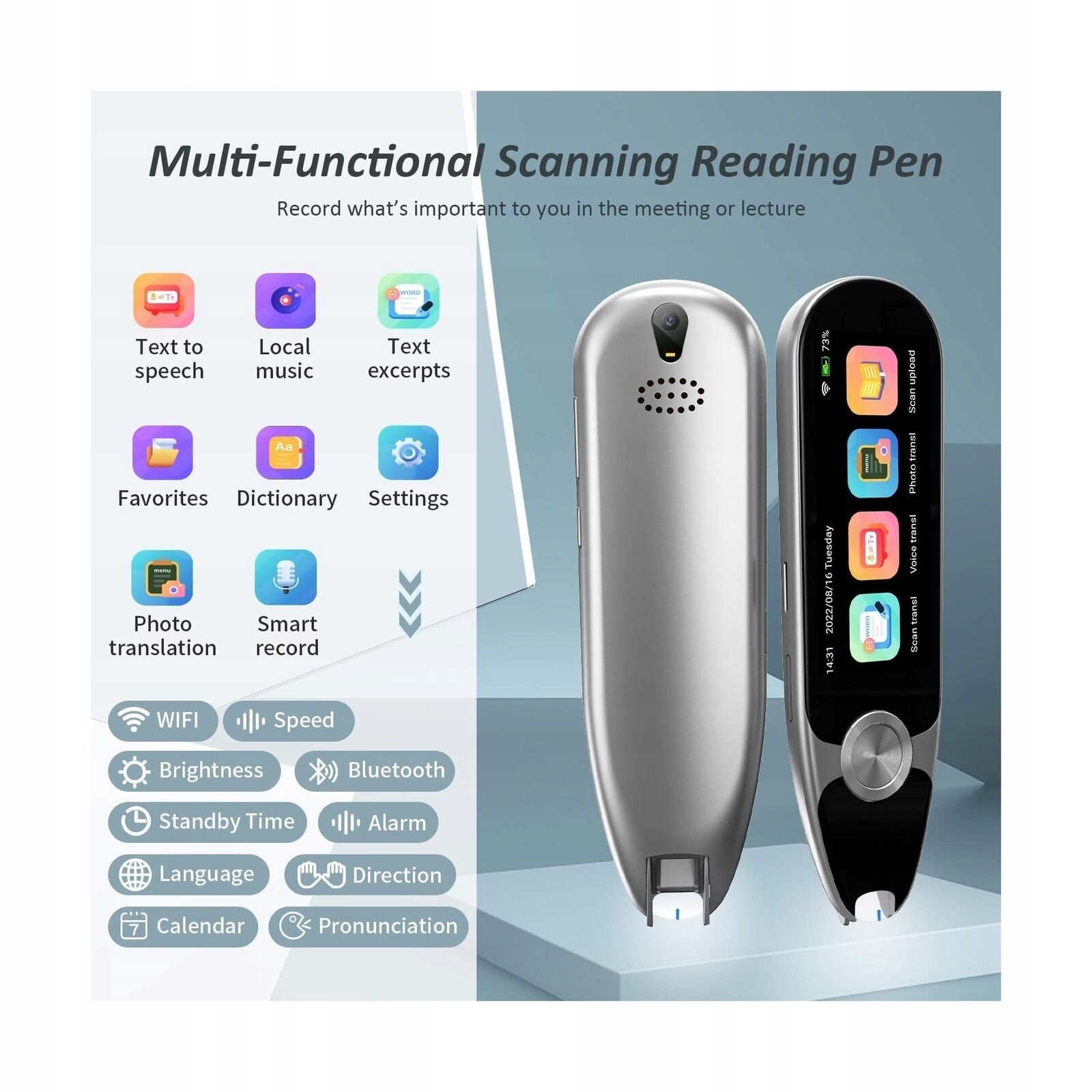 Сканер оснащен камерой высокого разрешения 5M и большой камерой 3,0. -дюймовый сенсорный экран 5 дюймов. Перо для чтения поддерживает 11 многоязычных переводов фотографий и подходит для одноразового перевода текста. Просто наведите камеру на любой текст, и стилус автоматически переведет его. Ленту для сканирования Reading Pen также можно использовать в качестве удобного диктофона для записи и сохранения всех важных интервью, встреч и разговоров.