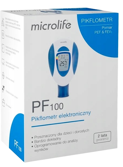 Microlife PF 100 — цифровое устройство для измерения пиковой скорости выдоха (ПСВ) и объема форсированного выдоха за одну секунду (ОФВ1) для мониторинга дыхания больных астмой. Устройство хранит 240 измерений и имеет порт USB, позволяющий передавать измерения на ПК. Управлять респираторным профилем пациента можно с помощью специального программного обеспечения для анализа астмы, поставляемого в комплекте с изделием или загруженного с нашего сайта.
