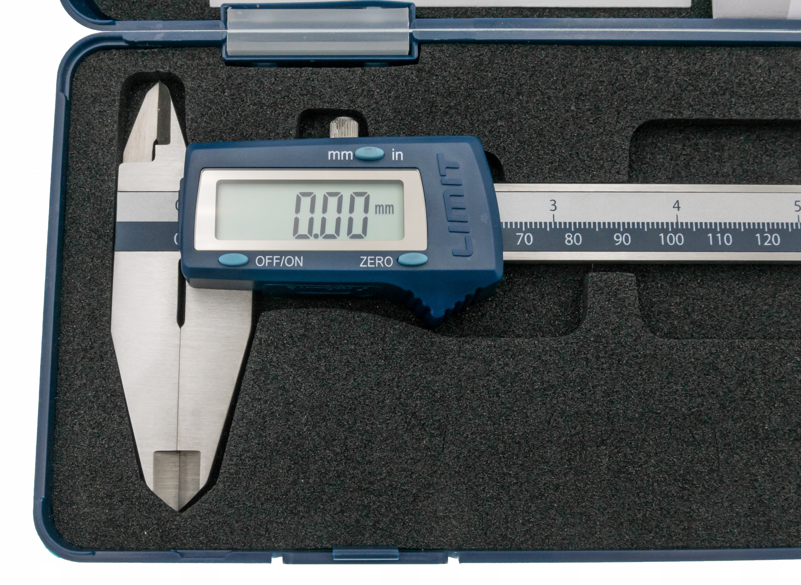 Цифровой штангенциркуль, соответствующий стандарту DIN 862. Три типа дисплея: десятичные мм/дюймы. Изготовлен из нержавеющей стали. Автоматическое включение и выключение питания. 4-функции измерения, относительное измерение.